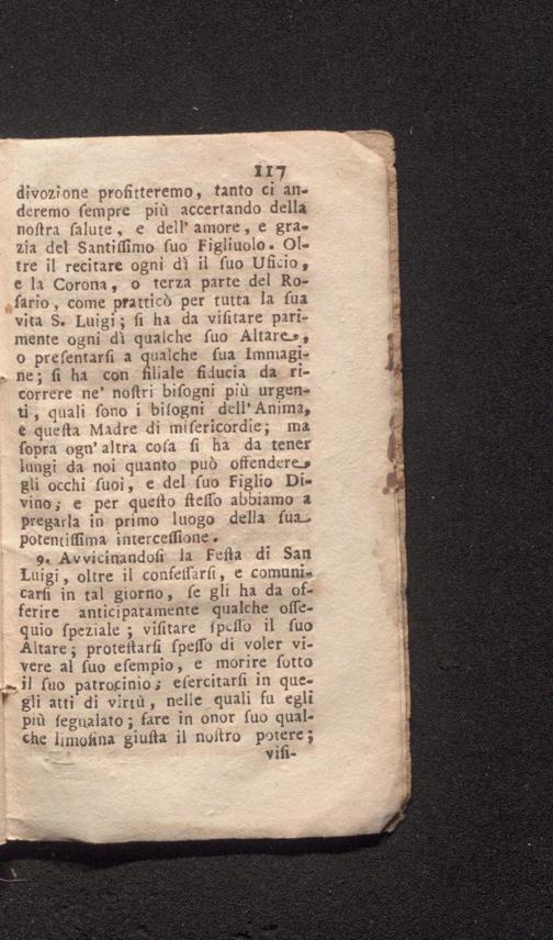 9. Avvicinandofi la Fefta di San Luigi, oltre il confeffarfi, e comunicarfi in tal giorno, fe gli ha da of ferire anticipatamente qualche offequio fpeziale; vifitare fpeflo il fuo Altare; proteítarfi fpeffo di voler vivere al fuo efempio, e morire fotto il fuo patrocinio'; efercitarfi in quegli atti di virtù, nelle quali fu egli più fegnalato; fare in onor fuo qualche limonina giufta il nostro potere; vifi