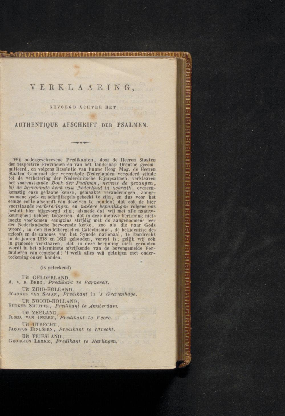 Wij ondergeschrevene Predikanten door de Heeren Staaten der respective Provinciën en van het landschap Drenthe gecommitteerd, en volgens Resolutie van hunne Hoog Mog. de Heeren Staaten Generaal der vereenigde Nederlanden vergaderd zijnde tot de verbetering der Nederduitsche Rijmpsalmen, verklaaren het voorenstaande Boek der Psalmen, nevens de gezangen, bij de hervormde kerk van Nederland in gebruik, overeenkomstig onze gedaane keuze, gemaakte veranderingen, aangenoomene spel- en schrijfregels geboekt te zijn, en dus voor het eenige echte afschrift van dezelven te houden; dat ook de hier voorstaande verbeteringen en nadere bepaalingen volgens ons besluit hier bijgevoegd zijn; alsmede dat wij met alle naauwkeurigheid hebben toegezien, dat in deze nieuwe berijming niets mogte voorkomen eenigzins strijdig met de aangenoomene leer der Nederlandsche hervormde kerke, zoo als die naar Gods woord, in den Heidelbergschen Catechismus, de belijdenisse des geloofs en de canones van het Synode nationaal, te Dordrecht in de jaaren 1618 en 1619 gehouden, vervat is; gelijk wij ook in gemoede verklaaren, dat in deze berijming niets gevonden wordt in het allerminste afwijkende van de bovengemelde Formulieren van eenigheid:' t welk alles wij getuigen met onderteekening onzer handen.