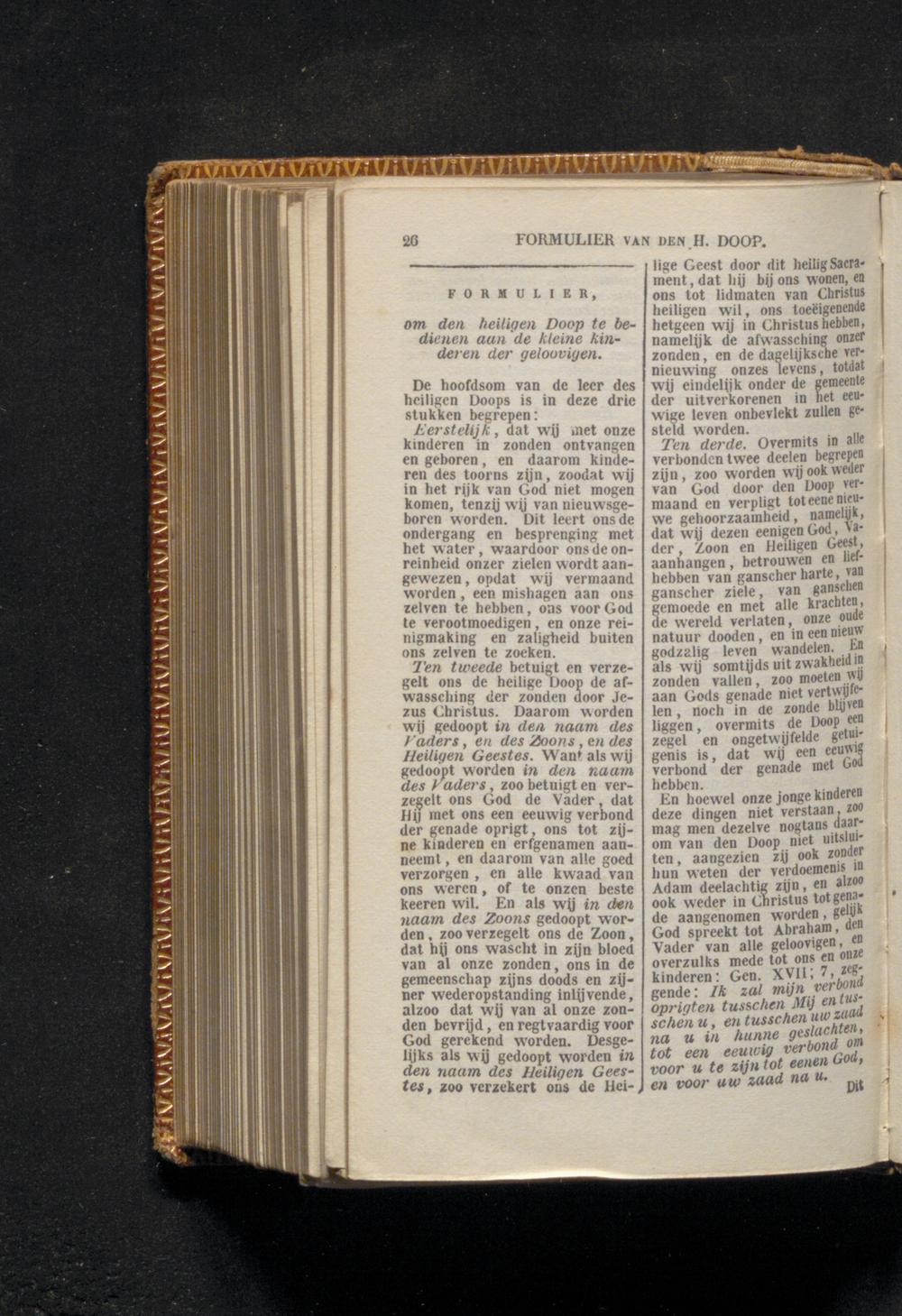 En hoewel onze jonge kinderen deze dingen niet verstaan, zoo mag men dezelve nogtans daarom van den Doop niet uitsluiten, aangezien zij ook zonder hun weten der verdoemenis in Adam deelachtig zijn, en alzoo ook weder in Christus tot genade aangenomen worden, gelijk God spreekt tot Abraham, den Vader van alle geloovigen, en overzulks mede tot ons en onze kinderen: Gen. XVII; 7, zeggende: Ik zal mijn verbond oprigten tusschen Mij en tusschen u, en tusschen uw zaad na u in hunne geslachten, tot een eeuwig verbond om voor u te zijn tot eenen God, en voor uw zaad na u.