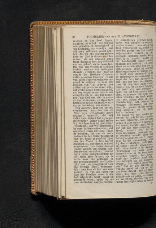 En opdat wij vast zouden gelooven, dat wij tot dit Genadeverbond behooren, nam de Heer Jezus in zijn laatste Avondmaal het brood, dankte, brak het en gaf het aan zijne jongeren, en sprak: neemt, eet, dat is mijn ligchaam, hetwelk voor u gegeven wordt: doet dat tot mijne gedachtenis! Desgelijks na het Avondmaal, hij den drinkbeker, zeide dank, en sprak: drinkt allen daaruit: deze beker is het Nieuwe Testament in mijn bloed, hetwelk voor u en voor velen vergoten wordt, tot vergeving der zonden; doet dat, zoo dikwijls als gij daarvan drinkt, tot mijne gedachte nis! dat is: zoo dikwijls güj van dit brood eet, en uit dezen beker drinkt, zult gij daardoor, als door eene gewisse gedachtenis en pand, vermaand en verzekerd worden van deze mijne hartelijke liefde en trouw je