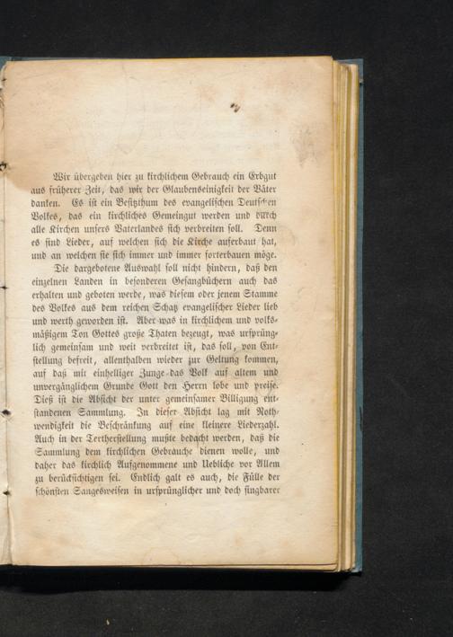 Wir übergeben hier zu kirchlichem Gebrauch ein Erbgut aus früherer Zeit, das wir der Glaubenseinigkeit der Väter danken. Es ist ein Besitzthum des evangelischen Deutschen Volkes, das ein firchliches Gemeingut werden und durch alle Kirchen unsers Vaterlandes sich verbreiten soll. Denn es sind Lieder, auf welchen sich die Kirche auferbaut hat, und an welchen sie sich immer und immer forterbauen möge. Die dargebotene Auswahl soll nicht hindern, daß den einzelnen Landen in besonderen Gesangbüchern auch das erhalten und geboten werde, was diesem oder jenem Stamme des Volkes aus dem reichen Schatz evangelischer Lieder lieb und werth geworden ist. Aber was in kirchlichem und volksmäßigem Ton Gottes große Thaten bezeugt, was ursprünglich gemeinsam und weit verbreitet ist, das soll, von Entstellung befreit, allenthalben wieder zur Geltung kommen, auf daß mit einhelliger Zunge das Volk auf altem und unvergänglichem Grunde Gott den Herrn lobe und preise. Dieß ist die Absicht der unter gemeinsamer Billigung entstandenen Sammlung. In dieser Absicht lag mit Nothwendigkeit die Beschränkung auf eine kleinere Liederzahl. Auch in der Tertherstellung mußte bedacht werden, daß die Sammlung dem firchlichen Gebrauche dienen wolle, und daher das firchlich Aufgenommene und lebliche vor Allem zu berücksichtigen sei. Endlich galt es auch, die Fülle der schönsten Sangesweisen in ursprünglicher und doch singbarer