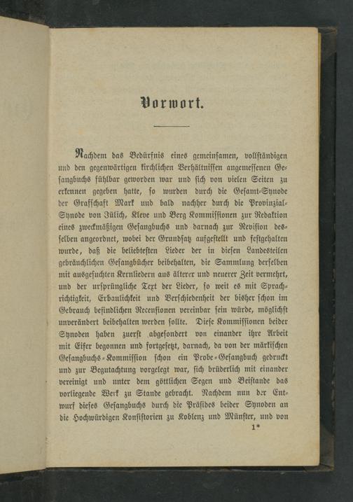 Nachdem das Bedürfnis eines gemeinſamen, vollſtändigen und den gegenwärtigen kirchlichen Verhältniſſen angemeſſenen Ge⸗ ſangbuchs fühlbar geworden war und ſich von vielen Seiten zu erkennen gegeben hatte, ſo wurden durch die Geſamt⸗Synode der Grafſchaft Mark und bald nachher durch die Provinzial⸗ Synode von Jülich, Kleve und Berg Kommiſſionen zur Redaktion eines zweckmäßigen Geſangbuchs und darnach zur Reviſion des⸗ ſelben angeordnet, wobei der Grundſatz aufgeſtellt und feſtgehalten wurde, daß die beliebteſten Lieder der in dieſen Landesteilen gebräuchlichen Geſangbücher beibehalten, die Sammlung derſelben mit ausgeſuchten Kernliedern aus älterer und neuerer Zeit vermehrt, und der urſprüngliche Text der Lieder, ſo weit es mit Sprach⸗ richtigkeit, Erbaulichkeit und Verſchiedenheit der bisher ſchon im Gebrauch befindlichen Recenſionen vereinbar ſein würde, möglichſt unverändert beibehalten werden ſollte. Dieſe Kommiſſionen beider Synoden haben zuerſt abgeſondert von einander ihre Arbeit mit Eifer begonnen und fortgeſetzt, darnach, da von der märkiſchen Geſangbuchs⸗Kommiſſion ſchon ein Probe⸗Geſangbuch gedruckt und zur Begutachtung vorgelegt war, ſich brüderlich mit einander vereinigt und unter dem göttlichen Segen und Beiſtande das vorliegende Werk zu Stande gebracht. Nachdem nun der Ent⸗ wurf dieſes Geſangbuchs durch die Präſides beider Synoden an die Hochwürdigen Konſiſtorien zu Koblenz und Münſter, und von