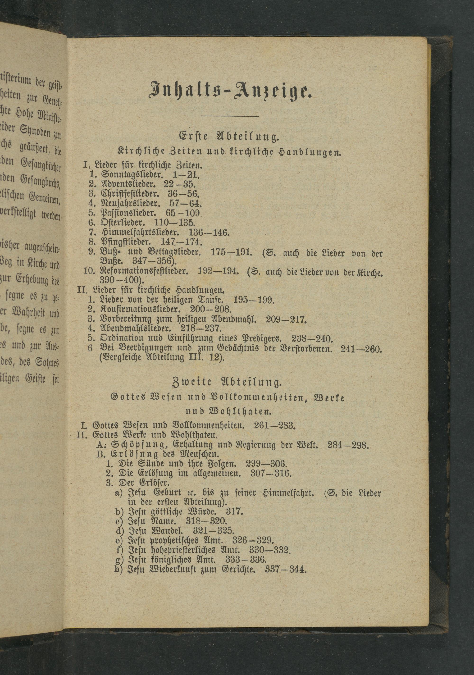 I. Gottes Weſen und Vollkommenheiten. 261—283. II. Gottes Werke und Wohlthaten. A. Schöpfung, Erhaltung und Regierung der Welt. 284—298. B. Erlöſung des Menſchen. 1. Die Sünde und ihre Folgen. 299—306. 2. Die Erlöſung im allgemeinen. 307— 316. 3. Der Erlöſer. a) Jeſu Geburt ꝛc. bis zu ſeiner Himmelfahrt.(S. die Lieder in der erſten Abteilung). b) Jeſu göttliche Würde. 317. c) Jeſu Name. 318— 320. d) Jeſu Wandel. 321— 325. e) Jeſu prophetiſches Amt. 326—329. f) Jeſu hoheprieſterliches Amt. 330— 332. g) Jeſu königliches Amt. 333— 336. n) Jeſu Wiederkunft zum Gerichte. 337— 344.