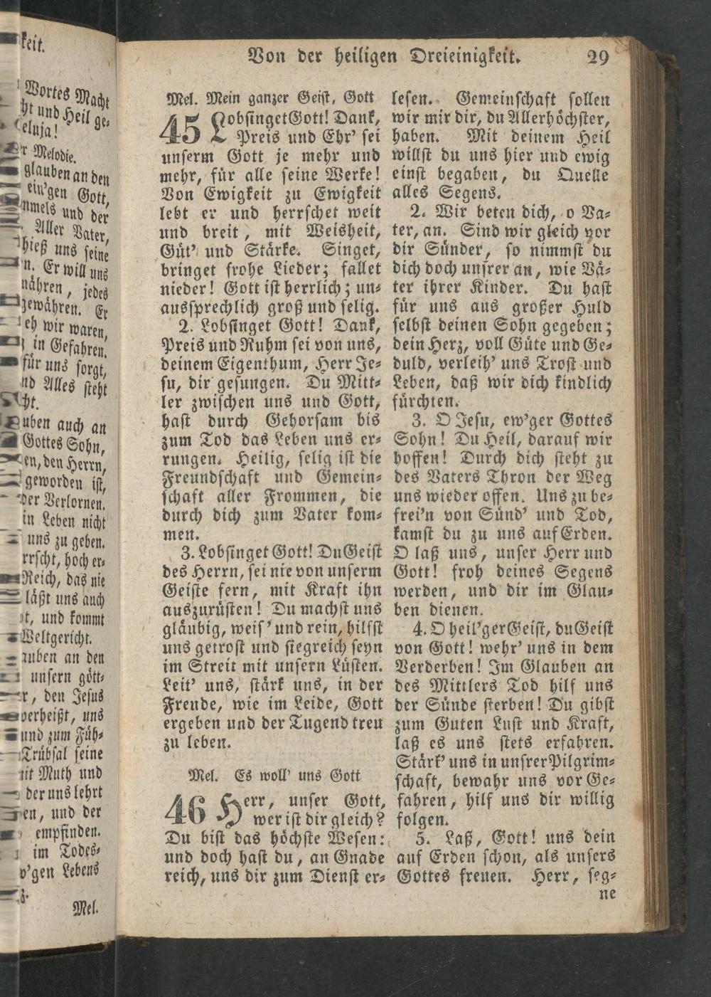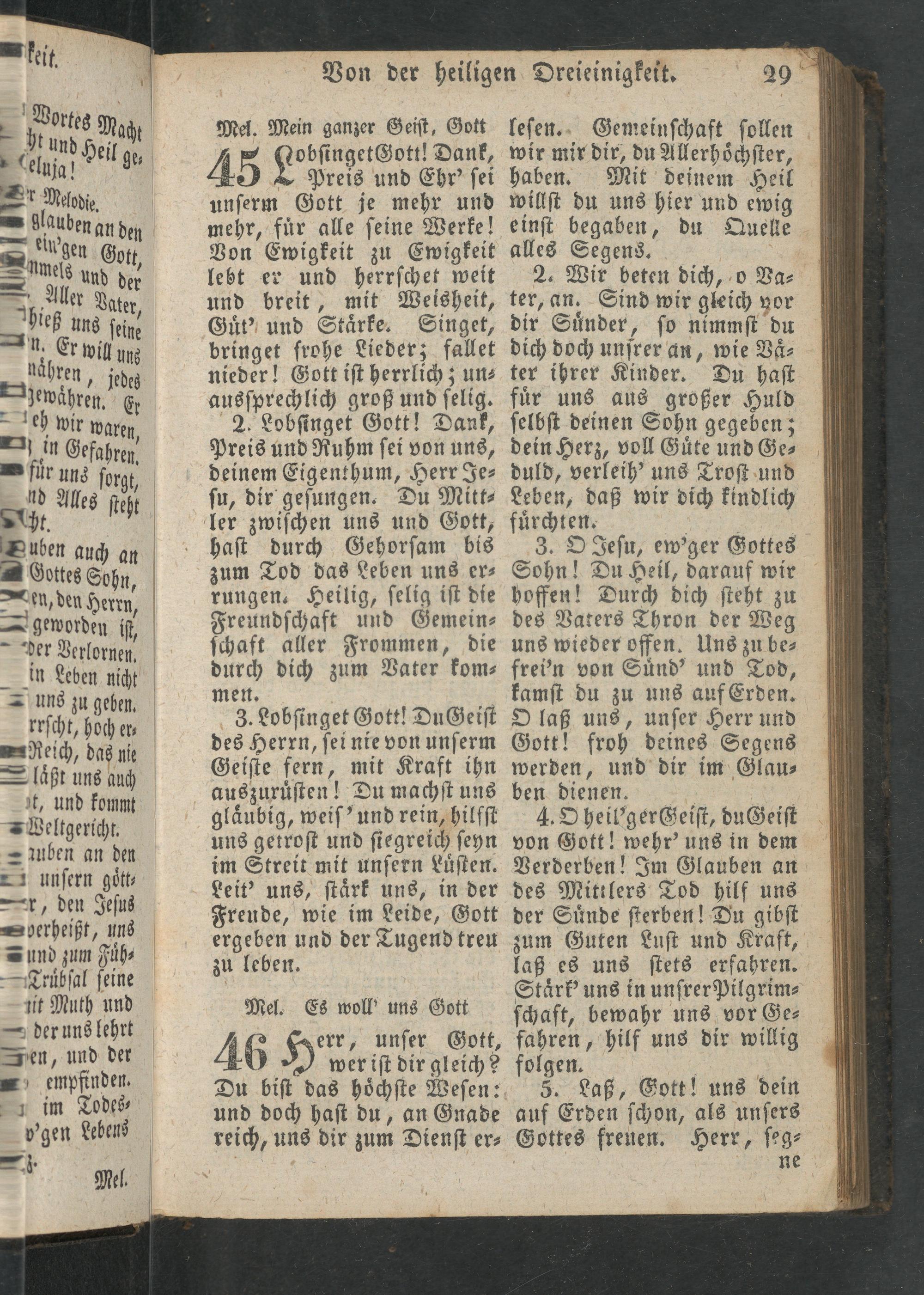 45 Lobſingeteott Hank, Preis und Ehr' ſei unſerm Gott je mehr und mehr, fuͤr alle ſeine Werke! Von Ewigkeit zu Ewigkeit lebt er und herrſchet weit und breit, mit Weisheit, Guͤt' und Staͤrke. Singet, bringet frohe Lieder; fallet nieder! Gott iſt herrlich; un⸗ ausſprechlich groß und ſelig. 2. Lobſinget Gott ! Dank, Preis und Ruhm ſei von uns, deinem Eigenthum, Herr Je⸗ ſu, dir geſungen. Du Mitt⸗