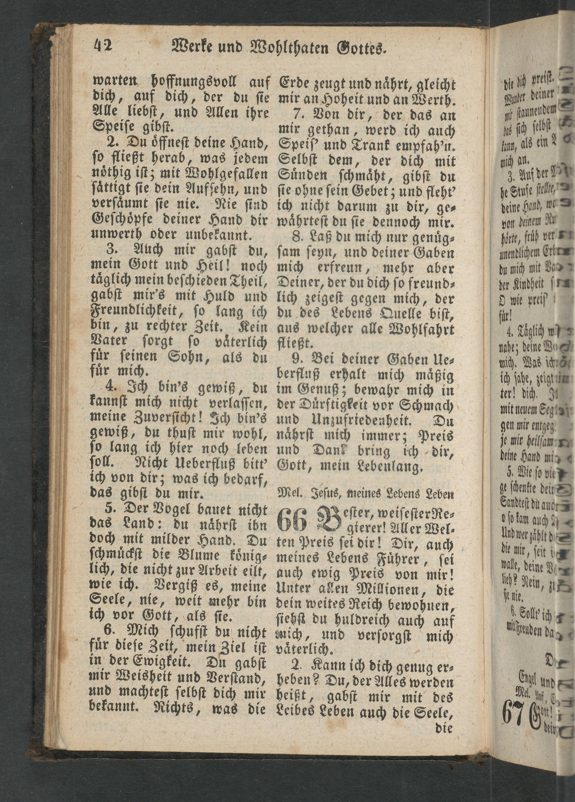 2. Du oͤffneſt deine Hand, ſo fließt herab, was jedem noͤthig iſt; mit Wohlgefallen ſaͤttigt ſie dein Aufſehn, und verſaͤumt ſie nie. Nie ſind Geſchoͤpfe deiner Hand dir unwerth oder unbekannt.