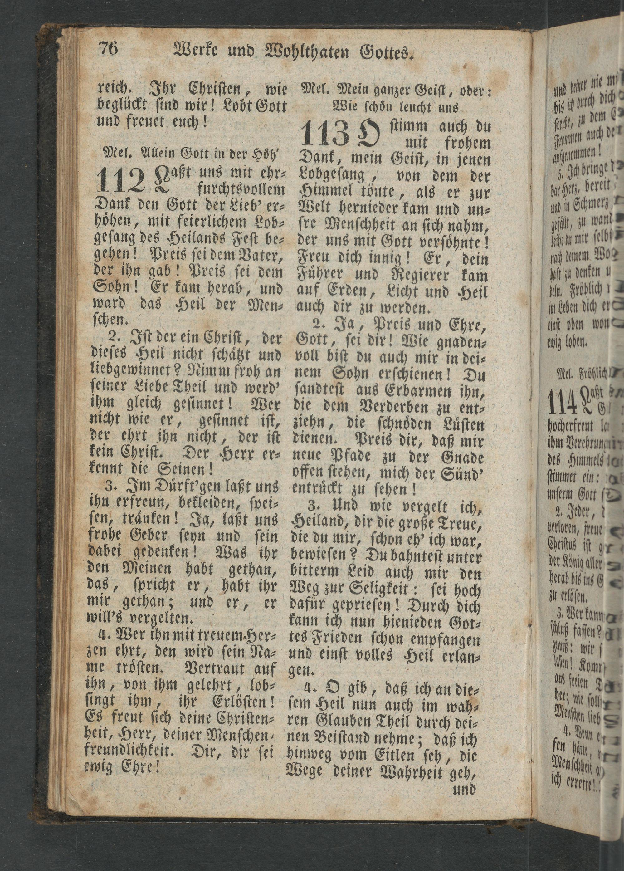 Dank, mein Geiſt, in jenen Lobgeſang, von dem der Himmel tönte, als er zur Welt hernieder kam und un⸗ ſre Menſchheit an ſich nahm, der uns mit Gott verſoͤhnte! Freu dich innig! Er, dein Fuͤhrer und Regierer kam auf Erden, Licht und Heil auch dir zu werden.