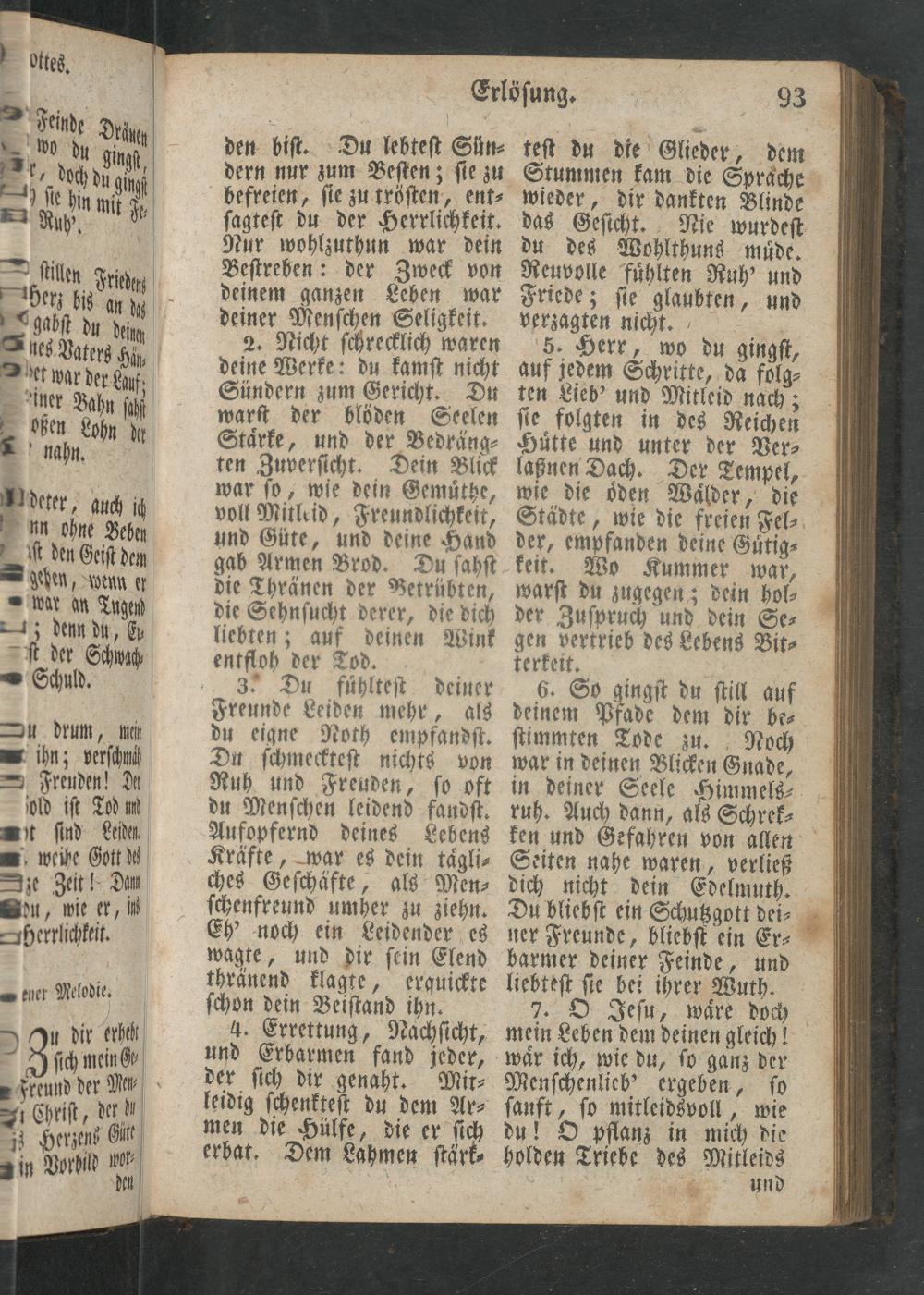 2. Nicht ſchrecklich waren deine Werke: du kamſt nicht Sündern zum Gericht. Du warſt der blöden Seelen Staͤrke, und der Bedräng⸗ ten Zuverſicht. Dein Blick war ſo, wie dein Gemuͤthe, voll Mitleid, Freundlichkeit, und Güte, und deine Hand gab Armen Brod. Du ſahſt die Thränen der Betrübten, die Sehnſucht derer, die dich liebten; auf deinen Wink entfloh der Tod.