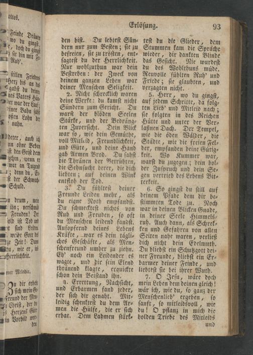 5. Herr, wo du gingſt, auf jedem Schritte, da folg⸗ ten Lieb' und Mitleid nach; ſie folgten in des Reichen Huͤtte und unter der Ver⸗ laßnen Dach. Der Tempel, wie die oͤden Waͤlder, die Städte, wie die freien Fel⸗ der, empfanden deine Guͤtig⸗ keit. Wo Kummer war, warſt du zugegen; dein hol⸗ der Zuſpruch und dein Se⸗ gen vertrieb des Lebens Bit⸗ terkeit.