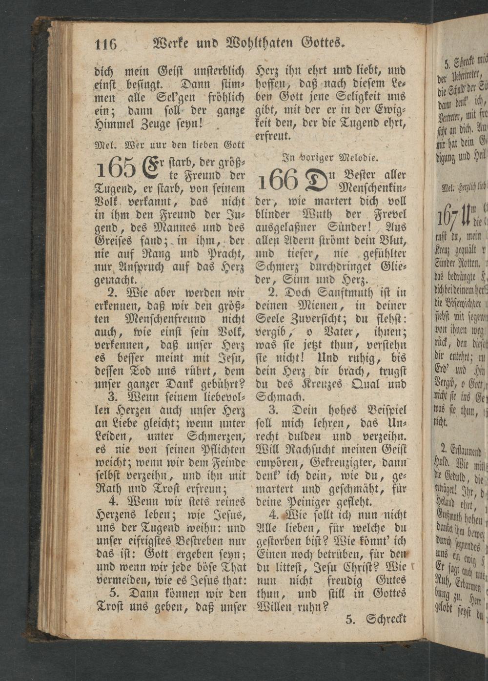 (r ſtarb, der größ⸗ 165 E te Freund der Tugend, er ſtarb, von ſeinem Volk verkannt, das nicht in ihm den Freund der Ju⸗ gend, des Mannes und des Greiſes fand; in ihm, der nie auf Rang und Pracht, nur Anſpruch auf das Herz gemacht. 2. Wie aber werden wir erkennen, daß wir den größ⸗ ten Menſchenfreund nicht auch, wie einſt ſein Volk, verkennen, daß unſer Herz es beſſer meint mit Jeſu, deſſen Tod uns rührt, dem unſer ganzer Dank gebührt? Wenn ſeinem liebevol⸗ len Herzen auch unſer Herz an Liebe gleicht; wenn unter Leiden, unter Schmerzen, es nie von ſeinen Pflichten