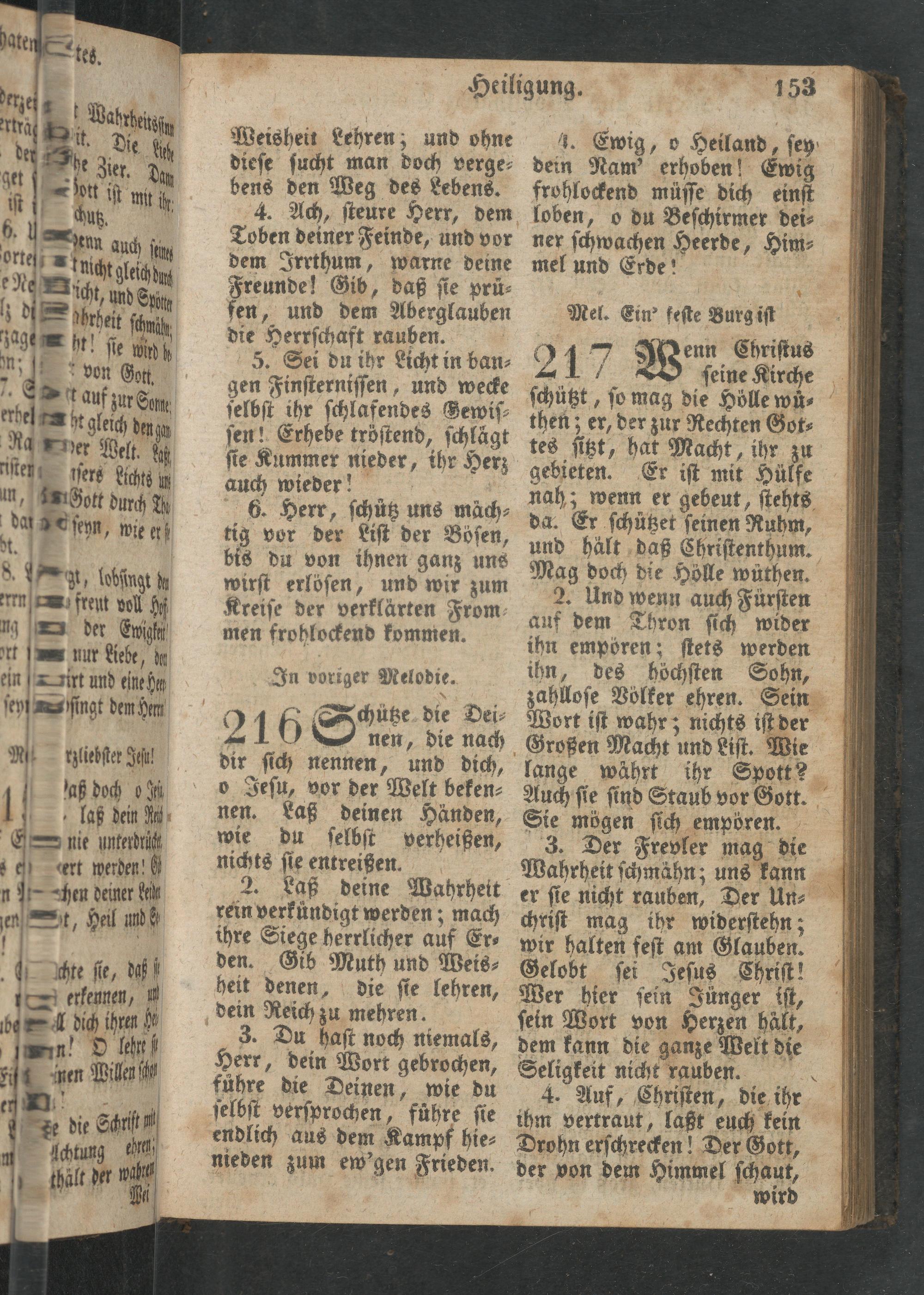 ſchützt, ſo mag die Hölle wuͤ⸗ then; er, der zur Rechten Got⸗ tes ſitzt, hat Macht, ihr zu gebieten. Er iſt mit Hülfe nah; wenn er gebeut, ſtehts da. Er ſchützet ſeinen Ruhm, und halt daß Chriſtenthum. Mag doch die Holle wuthen. 2. Und wenn auch Fuüͤrſten auf dem Thron ſich wider ihn empören; ſtets werden ihn, des höchſten Sohn, zahlloſe Völker ehren. Sein Wort iſt wahr; nichts iſt der Großen Macht und Liſt. Wie lange währt ihr Spott? Auch ſie ſind Staub vor Gott . Sie mögen ſich emporen. 3. Der Frevler mag die Wahrheit ſchmähn; uns kann er ſie nicht rauben, Der Un⸗ chriſt mag ihr widerſtehn; wir halten feſt am Glauben. Gelobt ſei Jeſus Chriſt ! Wer hier ſein Juͤnger iſt, ſein Wort von Herzen halt, dem kann die ganze Welt die Seligkeit nicht rauben. 4 4. Auf, Chriſten, die ihr ihm vertraut, laßt euch kein Drohn erſchrecken! Der Gott, der von dem Himmel ſchaut, wird
