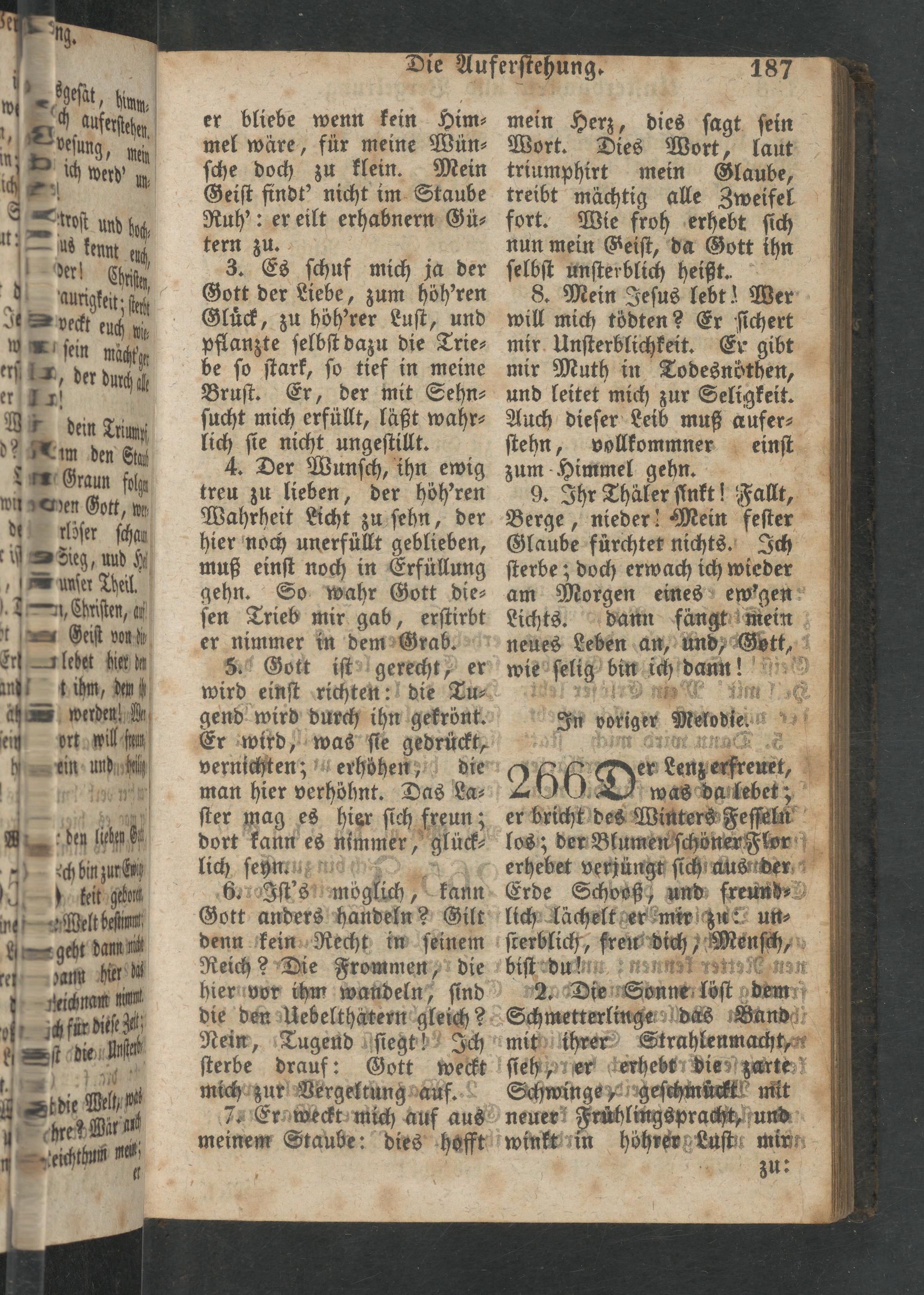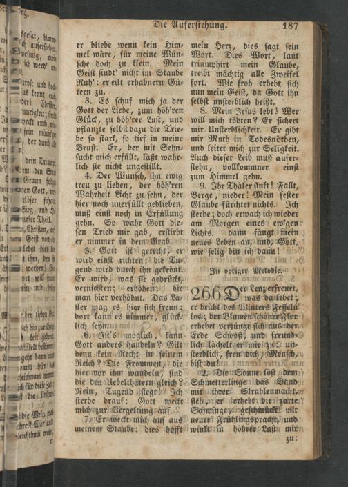 8. Mein Jeſus lebt! Wer will mich tödten? Er ſichert mir Unſterblichkeit. Er gibt mir Muth in Todesnöthen, und leitet mich zur Seligkeit. Auch dieſer Leib muß aufer⸗ ſtehn, vollkommner einſt zum Himmel gehn.