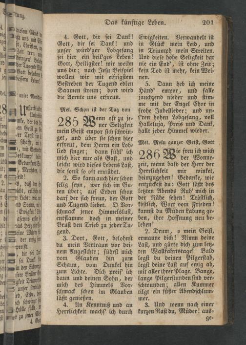 leben! 2. Drum, o mein Geiſt, ermanne dich! Nimm deine Laſt, und gürte dich zum letz⸗ Bald legſt du deinen Pilgerſtab, legſt deine Laſt auf ewig ab, mit aller ihrer Plage. Bange, lange Pilgerſtunden ſind ver⸗ ſchwunden; allen Kummer tilgt ein fuͤßer Abendſchlum⸗