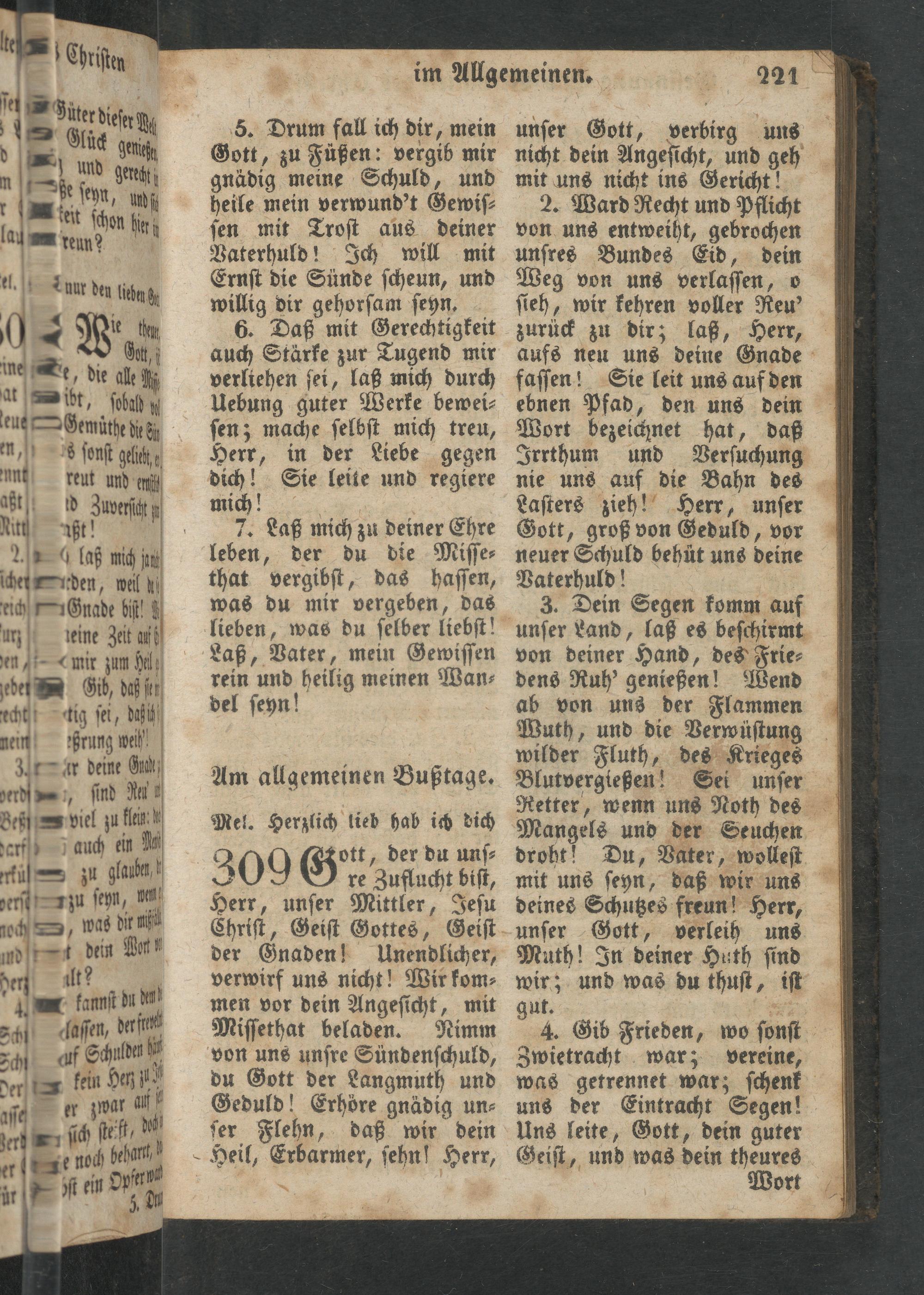 unſer Gott, verbirg uns nicht dein Angeſicht, und geh mit uns nicht ins Gericht! 2. Ward Recht und Pflicht von uns entweiht, gebrochen unſres Bundes Eid, dein Weg von uns verlaſſen, o ſieh, wir kehren voller Reu' zurück zu dir; laß, Herr, aufs neu uns deine Gnade faſſen! Sie leit uns auf den ebnen Pfad, den uns dein Wort bezeichnet hat, daß Irrthum und Verſuchung nie uns auf die Bahn des Laſters zieh! Herr, unſer Gott, groß von Geduld, vor neuer Schuld behüt uns deine Vaterhuld! 3. Dein Segen komm auf unſer Land, laß es beſchirmt von deiner Hand, des Frie⸗ dens Ruh' genießen! Wend ab von uns der Flammen Wuth, und die Verwüſtung wilder Fluth, des Krieges Blutvergießen! Sei unſer Retter, wenn uns Noth des Mangels und der Seuchen droht! Du, Vater, wolleſt mit uns ſeyn, daß wir uns deines Schutzes freun Herr, unſer Gott, verleih uns Muth! In deiner Huth ſind wir; und was du thuſt, iſt