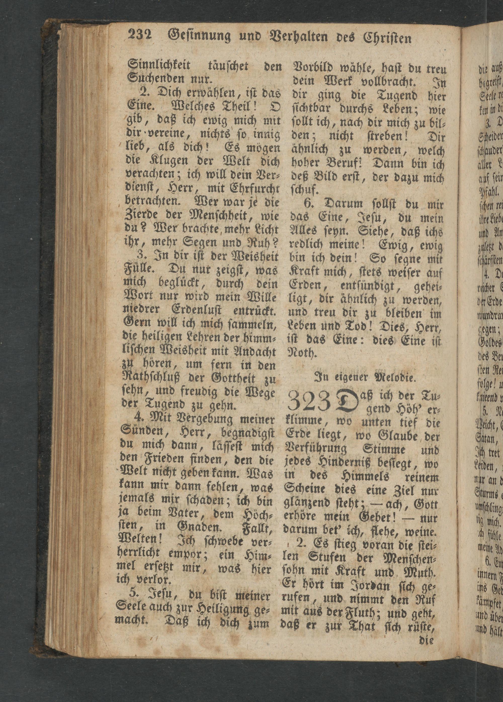 Sinnlichkeit täuſchet den Suchenden nur. 2. Dich erwählen, iſt das Eine. Welches Theil! O gib, daß ich ewig mich mit dir vereine, nichts ſo innig lieb, als dich! Es möogen die Klugen der Welt dich verachten; ich will dein Ver⸗ dienſt, Herr, mit Ehrfurcht betrachten. Wer war je die Zierde der Menſchheit, wie du? Wer brachte mehr Licht ihr, mehr Segen und Ruh? 3. In dir iſt der Weisheit Fuͤlle. Du nur zeigſt, was mich begluͤckt, durch dein Wort nur wird mein Wille niedrer Erdenluſt entrückt. Gern will ich mich ſammeln, die heiligen Lehren der himm⸗ liſchen Weisheit mit Andacht zu horen, um fern in den