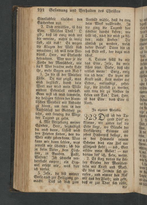 080 Jaß ich der Tu⸗ 323 O gend Höh' er⸗ klimme, wo unten tief die Erde liegt, wo Glaube der Verführung Stimme und jedes Hinderniß beſtegt, wo in des Himmels reinem Scheine dies eine Ziel nur glänzend ſteht;— ach, Gott erhöre mein Gebet!— nur darum bet' ich, flehe, weine. 2. Es ſtieg voran die ſtei⸗ len Stufen der Menſchen⸗ ſohn mit Kraft und Muth. Er hört im Jordan ſich ge⸗ rufen, und nimmt den Ruf mit aus der Fluth; und geht, daß er zur That ſich rüſte
