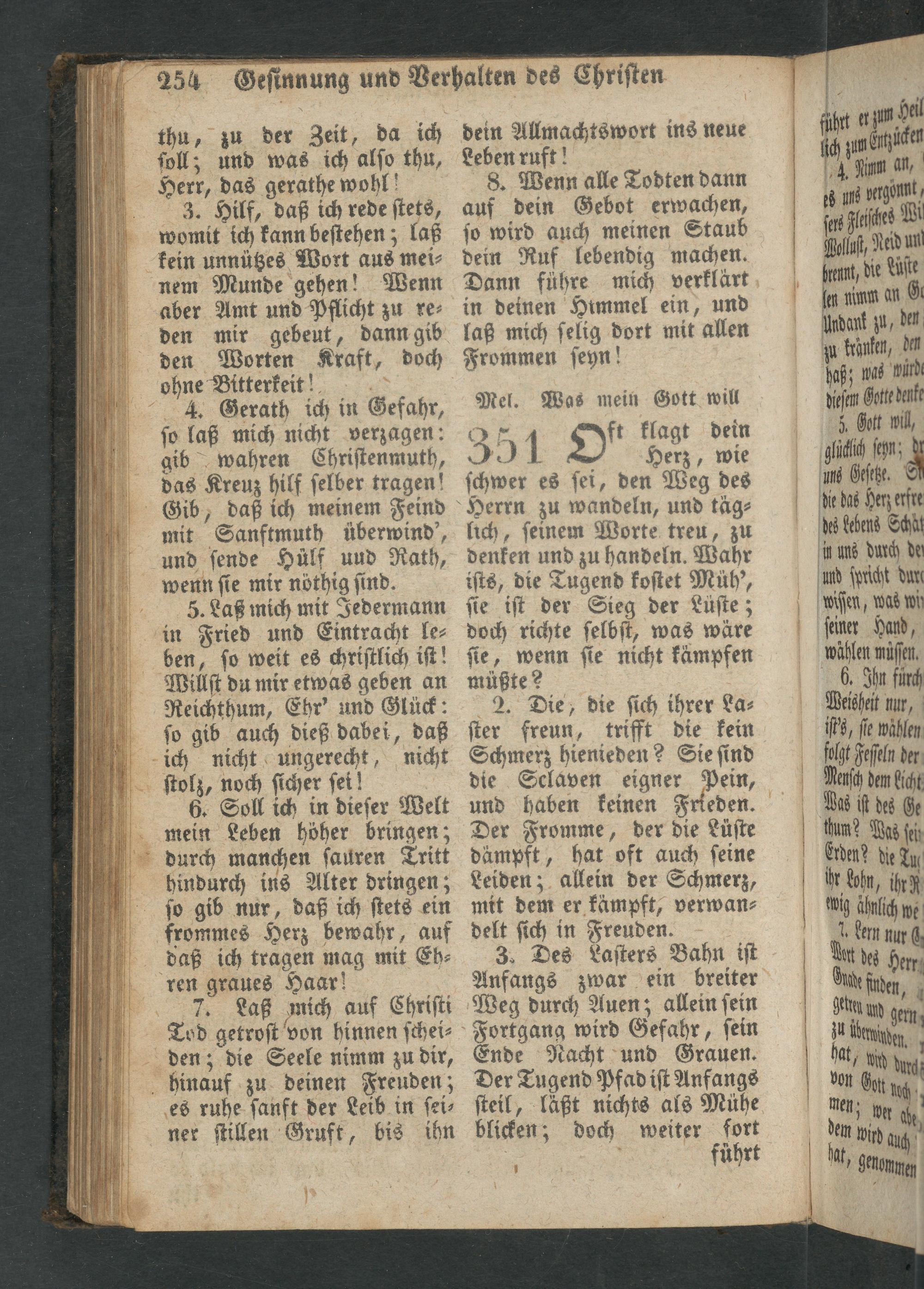 4. Gerath ich in Gefahr, ſo laß mich nicht verzagen: gib wahren Chriſtenmuth, das Kreuz hilf ſelber tragen! Gib, daß ich meinem Feind mit Sanftmuth überwind'’, und ſende Hülf und Rath, wenn ſie mir nöthig ſind.