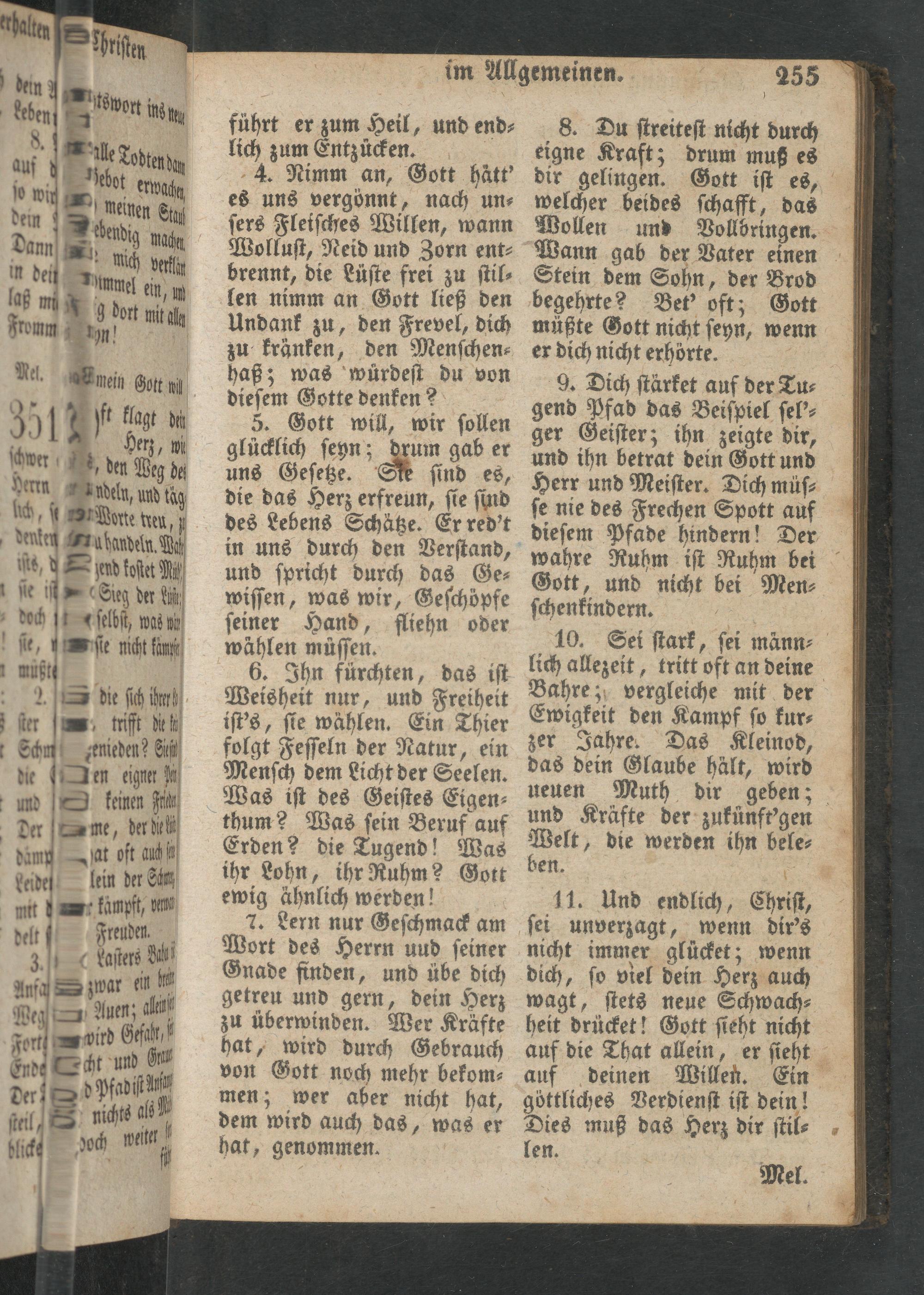 8. Du ſtreiteſt nicht durch eigne Kraft; drum muß es dir gelingen. Gott iſt es, welcher beides ſchafft, das Wollen und Vollbringen. Wann gab der Vater einen Stein dem Sohn, der Brod begehrte? Bet' oft; Gott müßte Gott nicht ſeyn, wenn er dich nicht erhörte.