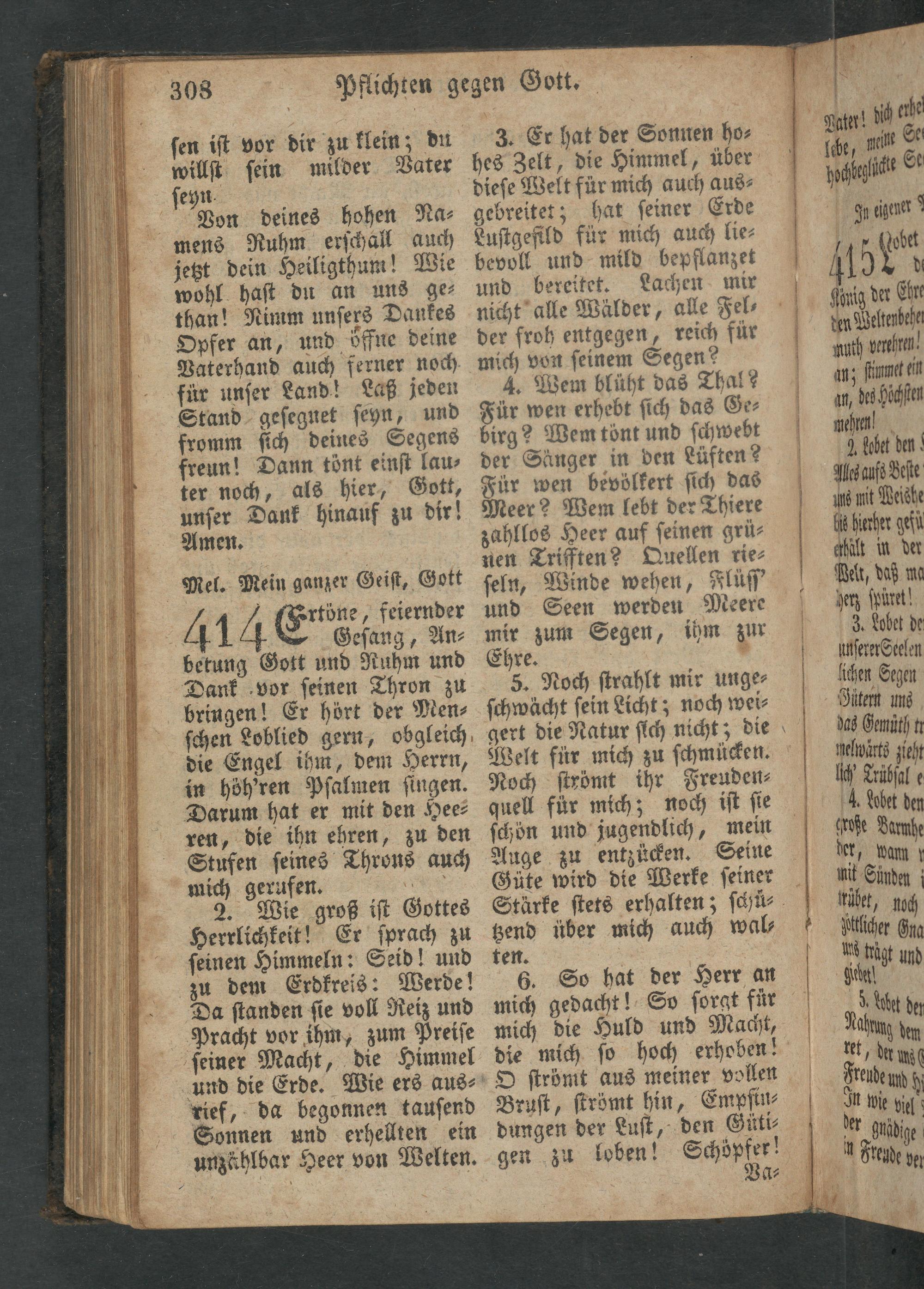 ſeyn Von deines hohen Na⸗ mens Ruhm erſchall auch jetzt dein Heiligthum! Wie wohl haſt du an uns ge⸗ than! Nimm unſers Dankes Opfer an, und öffne deine Vaterhand auch ferner noch für unſer Land! Laß jeden Stand geſegnet ſeyn, und fromm ſich deines Segens freun! Dann tönt einſt lau⸗ ter noch, als hier, Gott, unſer Dank hinauf zu dir! Amen. b Mel. Mein ganzer Geiſt, Gott 7 1 4 Prtöne, feiernder 4◻ 4 Geſang, An⸗ betung Gott und Ruhm und Dank vor ſeinen Thron zu bringen! Er hört der Men⸗