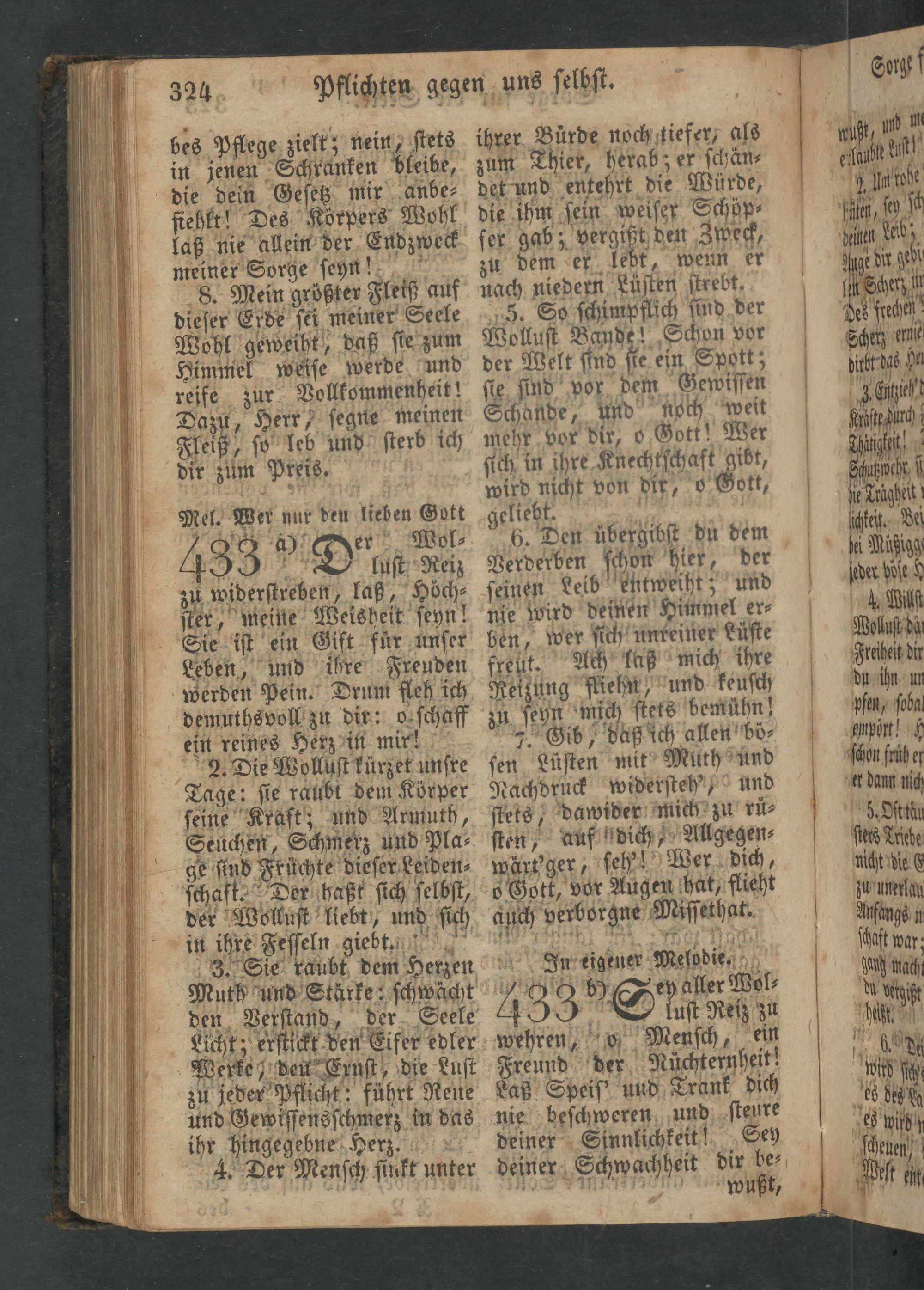 ihrer Buͤrde noch tiefer, als zum Thier, herab; er ſchän⸗ det und entehrt die Würde, die ihm ſein weiſer Schöp⸗ fer gab; vergißt den Zweck, zu dem er lebt, wenn er nach niedern Luſten ſtrebt. 5. So ſchimpflich ſind der Wolluſt Bande! Schon vor der Welt ſind ſie ein Spott; ſte ſind vor dem Gewiſſen Schande, und noch weit mehr vor dir, o Gott! Wer ſich in ihre Knechtſchaft gibt, wird nicht von dir, o Gott, geliebt. b 6. Den übergibſt du dem Verderben ſchon hier, der ſeinen Leib entweiht; und nie wird deinen Himmel er⸗ ben, wer ſich unreiner Luͤſte freut. Ach laß mich ihre Reizung fliehn, und keuſch zu ſeyn mich ſtets bemühn! . Gib, daß ich allen bö⸗ ſen Luſten mit Muth und Nachdruck widerſteh, und ſtets, dawider mich zu ruͤ⸗ ſten, auf dich, Allgegen⸗ wärt'ger, ſeh'! Wer dich,
