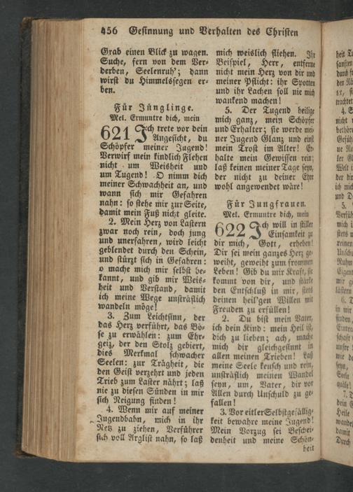 2. Mein Herz von Laſtern zwar noch rein, doch jung und unerfahren, wird leicht geblendet durch den Schein, und ſtürzt ſich in Gefahren: o mache mich mir ſelbſt be⸗ kannt, und gib mir Weis⸗ heit und Verſtand, damit ich meine Wege unſträflich wandeln möge!