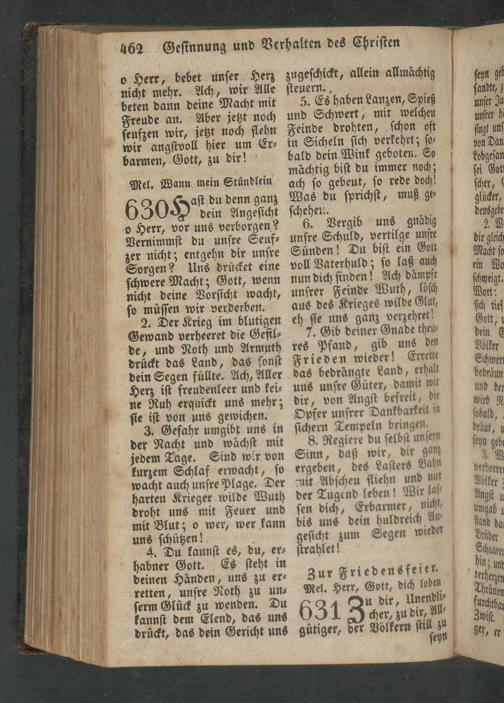 2. Der Krieg im blutigen Gewand verheeret die Gefil⸗ de, und Noth und Armuth drückt das Land, das ſonſt dein Segen füllte. Ach, Aller