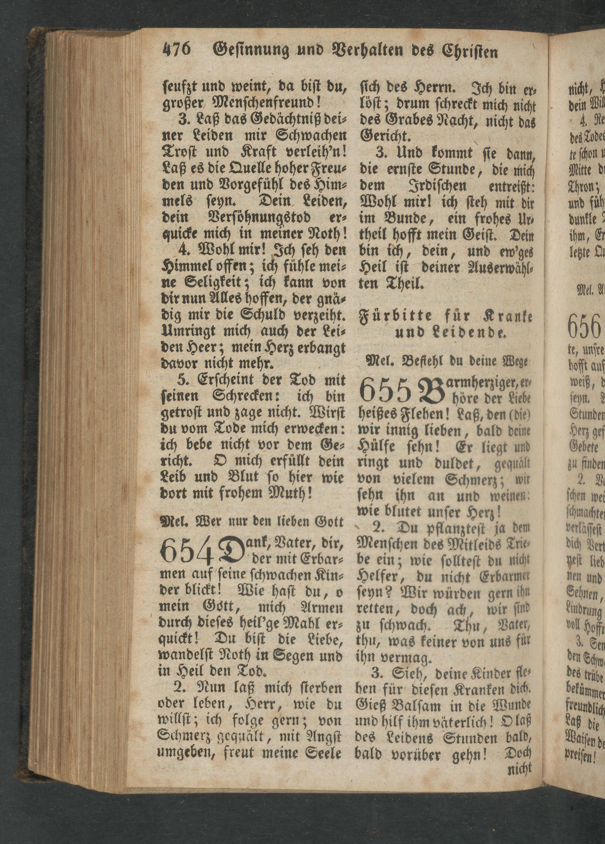höre der Liebe heißes Flehen! Laß, den(die) wir innig lieben, bald deine Huͤlfe ſehn! Er liegt und ringt und duldet, gequält von vielem Schmerz; wir ſehn ihn an und weinen. wie blutet unſer Herz!