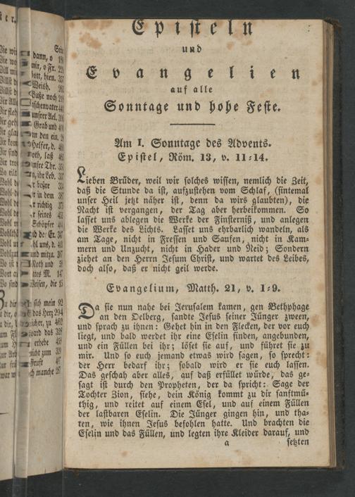 De ſie nun nahe bei Jeruſalem kamen, gen Bethphage an den Oelberg, ſandte Jeſus ſeiner Jünger zween, und ſprach zu ihnen: Gehet hin in den Flecken, der vor euch liegt, und bald werdet ihr eine Eſelin finden, angebunden, und ein Füllen bei ihr; löſet ſie auf, und führet ſie zu mir. Und ſo euch jemand etwas wird ſagen, ſo ſprecht: der Herr bedarf ihr; ſobald wird er ſie euch laſſen. Das geſchah aber alles, auf daß erfüllet würde, das ge⸗ ſagt iſt durch den Propheten, der da ſpricht: Sage der Tochter Zion, ſiehe, dein König kommt zu dir ſanftmü⸗ thig, und reitet auf einem Eſel, und auf einem Füllen der laſtbaren Eſelin. Die Jünger gingen hin, und tha⸗ ten, wie ihnen Jeſus befohlen hatte. Und brachten die Eſelin und das Füllen, und legten ihre Kleider deraur und