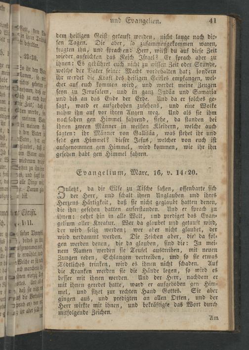 Evangelium, Marc. 16, v. 14⸗20. Zuletzt, da die Eilfe zu Tiſche ſaßen, offenbarte ſich der Herr, und ſchalt ihren Unglauben und ihres Herzens Härtigkeit, daß ſie nicht geglaubt hatten denen, die ihn geſehen hatten auferſtanden. Und er ſprach zu ihnen: gehet hin in alle Welt, und prediget das Evan⸗ gelium aller Kreatur. Wer da glaubet und getauft wird, der wird ſelig werden; wer aber nicht glaubet, der wird verdammt werden. Die Zeichen aber, die da fol⸗ gen werden denen, die da glauben, ſind die: In mei⸗ nem Namen werden ſie Teufel austreiben, mit neuen Zungen reden, Schlangen vertreiben, und ſo ſie etwas Tödtliches trinken, wird es ihnen nicht ſchaden. Auf die Kranken werden ſie die Hände legen, ſo wird es beſſer mit ihnen werden. Und der Herr, nachdem er mit ihnen geredet hatte, ward er aufgehoben gen Him⸗ mel, und ſitzet zur rechten Hand Gottes. Sie aber gingen aus, und predigten an allen Orten, und der Herr wirkte mit ihnen, und bekräftigte das Wort durch