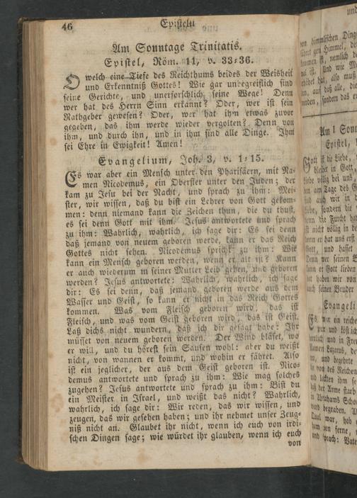 Am Sonntage Trinitatis. Epiſtel, Röm. 11, v. 33⸗36. welch eine Tiefe des Reichthums beides der Weisheit 2) und Erkenntniß Gottes! Wie gar unbegreiflich ſind ſeine Gerichte, und unerforſchlich ſeine Wege! Denn wer hat des Herrn Sinn erkannt? Oder, wer iſt ſein Rathgeber geweſen? Oder, wer hat ihm etwas zuvor gegeben,