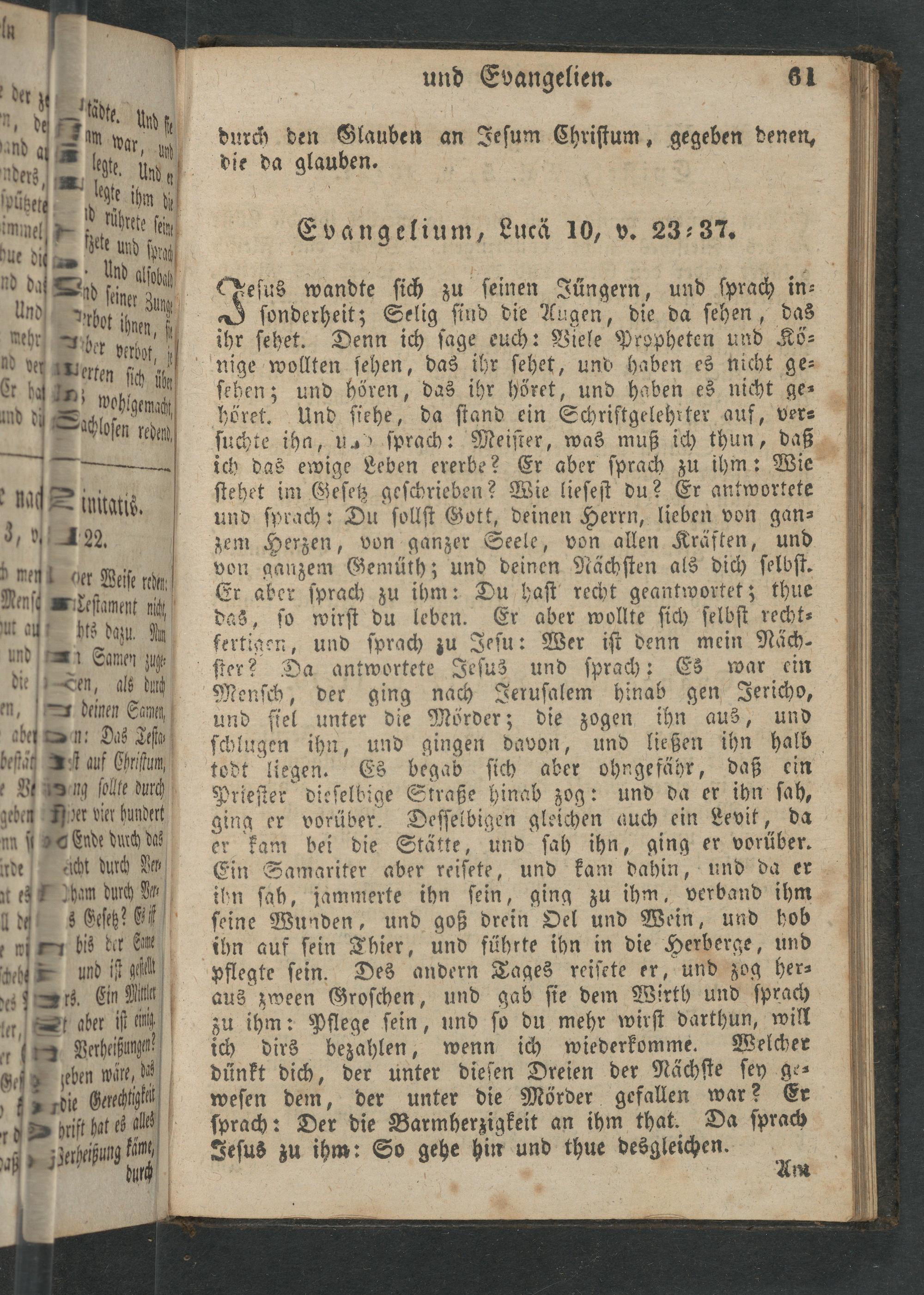 (Teſus wandte ſich zu ſeinen Jüngern, und ſprach in⸗ ₰ ſonderheit; Selig ſind die Augen, die da ſehen, das ihr ſehet. Denn ich ſage euch: Viele Propheten und Kö⸗ nige wollten ſehen, das ihr ſehet, und haben es nicht ge⸗ ſehen; und hören, das ihr höret, und haben es nicht ge⸗ höret. Und ſiehe, da ſtand ein Schriſtgelehrter auf, ver⸗ ſuchte ihn, u. ſprach: Meiſter, was muß ich thun, daß ich das ewige Leben ererbe? Er aber ſprach zu ihm: Wie ſtehet im Geſetz geſchrieben? Wie lieſeſt du? Er antwortete und ſprach: Du ſollſt Gott , deinen Herrn, lieben von gan⸗ zem Herzen, von ganzer Seele, von allen Kräften, und von ganzem Gemüth; und deinen Nächſten als dich ſelbſt. Er aber ſprach zu ihm: Du haſt recht geantwortet; thue das, ſo wirſt du leben. Er aber wollte ſich ſelbſt recht⸗ fertigen, und ſprach zu Jeſu : Wer iſt denn mein Näch⸗ Da antwortete Jeſus und ſprach: Es war ein Menſch, der ging nach Jeruſalem hinab gen Jericho , und ſiel unter die Mörder; die zogen ihn aus, und ſchlugen ihn, und gingen davon, und ließen ihn halb todt liegen. Es begab ſich aber ohngefähr, daß ein Prieſter dieſelbige Straße hinab zog: und da er ihn ſah, ging er vorüber. Deſſelbigen gleichen auch ein Levit, da er kam bei die Stätte, und ſah ihn, ging er vorüber. Ein Samariter aber reiſete, und kam dahin, und da er ihn ſah, jammerte ihn ſein, ging zu ihm, verband ihm ſeine Wunden, und goß drein Oel und Wein, und hob ihn auf ſein Thier, und führte ihn in die Herberge, und pflegte ſein. Des andern Tages reiſete er, und zog her⸗ aus zween Groſchen, und gab ſie dem Wirth und ſprach zu ihm: Pflege ſein, und ſo du mehr wirſt darthun, will ich dirs bezahlen, wenn ich wiederkomme. Welcher dünkt dich, der unter dieſen Dreien der Nächſte ſey ge⸗ weſen dem, der unter die Mörder gefallen war? Er ſprach: Der die Barmherzigkeit an ihm that. Da ſprach
