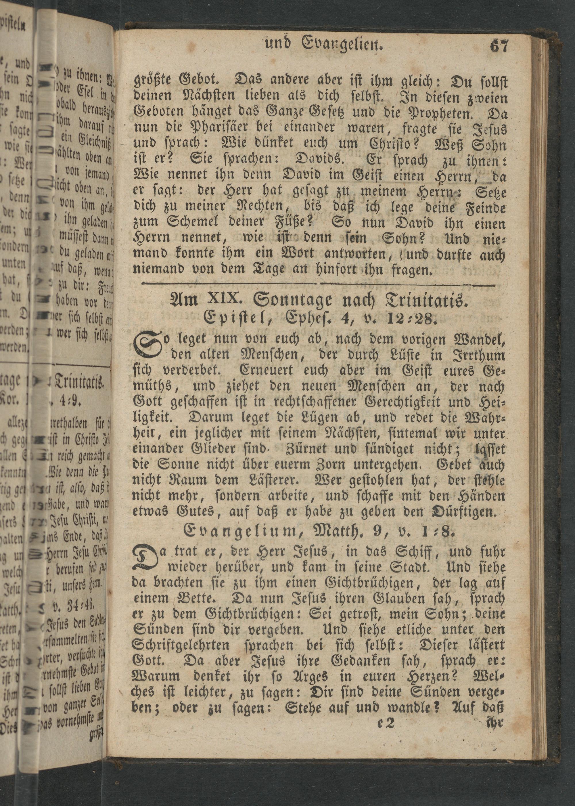 ſich verderbet. Erneuert euch aber im Geiſt eures Ge⸗ müths, und ziehet den neuen Menſchen an, der nach Gott geſchaffen iſt in rechtſchaffener Gerechtigkeit und Hei⸗ ligkeit. Darum leget die Lügen ab, und redet die Wahr⸗ heit, ein jeglicher mit ſeinem Nächſten, ſintemal wir unter einander Glieder ſind, Zürnet und ſündiget nicht; laſſet die Sonne nicht über euerm Zorn untergehen. Gebet auch nicht Raum dem Läſterer. Wer geſtohlen hat, der ſtehle nicht mehr, ſondern arbeite, und ſchaffe mit den Händen etwas Gutes, auf daß er habe zu geben den Dürftigen. Evangelium, Matth . 9, v. 1⸗8.