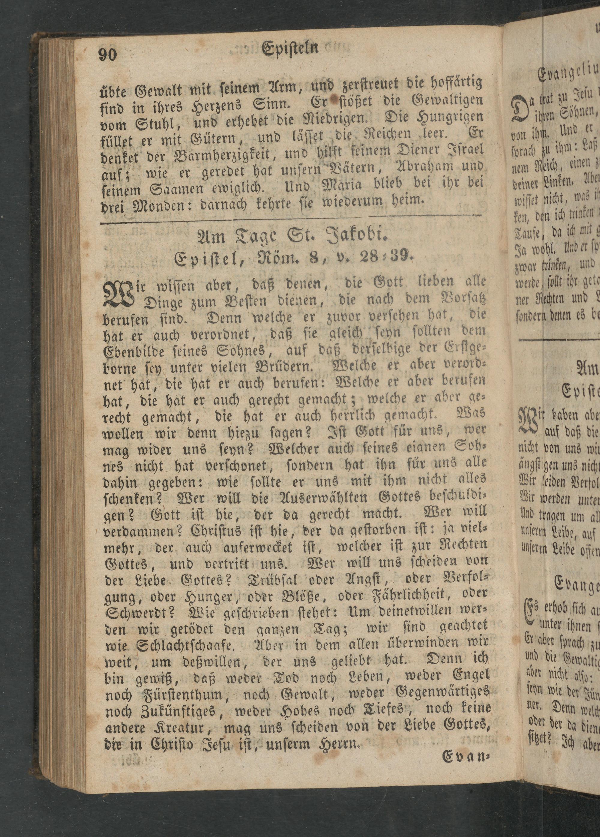 Dinge zum Beſten dienen, die nach dem Vorſatz berufen ſind. Denn welche er zuvor verſehen hat, die hat er auch verordnet, daß ſie gleich ſeyn ſollten dem Ebenbilde ſeines Sohnes, auf daß derſelbige der Erſtge⸗ borne ſey unter vielen Brüdern. Welche er aber verord⸗ net hat, die hat er auch berufen: Welche er aber berufen hat, die hat er auch gerecht gemacht; welche er aber ge⸗ recht gemacht, die hat er auch herrlich gemacht. Was wollen wir denn hiezu ſagen? Iſt Gott für uns, wer mag wider uns ſeyn? Welcher auch ſeines eianen Soh⸗ nes nicht hat verſchonet, ſondern hat ihn für uns alle dahin gegeben: wie ſollte er uns mit ihm nicht alles ſchenken? Wer will die Auserwählten Gottes beſchuldi⸗ gen? Gott iſt hie, der da gerecht macht. Wer will verdammen? Chriſtus iſt hie, der da geſtorben iſt: ja viel⸗ mehr, der auch auferwecket iſt, welcher iſt zur Rechten Gottes, und vertritt uns. der Liebe Gottes? Trübſal oder Angſt, oder Verfol⸗ gung, oder Hunger, oder Blöße, oder Fährlichheit, oder Schwerdt? Wie geſchrieben ſtehet: Um deinetwillen wer⸗ den wir getödet den ganzen Tag; wir ſind geachtet wie Schlachtſchaafe. Aber in dem allen überwinden wir weit, um deßwillen, der uns geliebt hat. Denn ich bin gewiß, daß weder Tod noch Leben, weder Engel