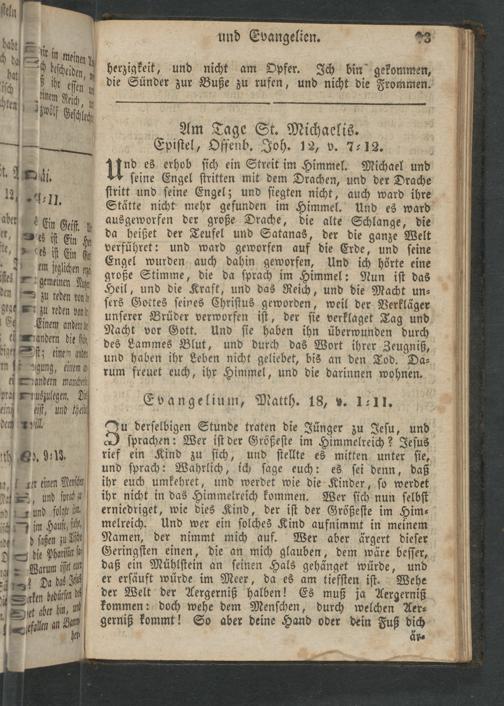 Ju derſelbigen Stunde traten die Jünger zu Jeſu, und 2 ſprachen: Wer iſt der Größeſte im Himmelreich? Jeſus rief ein Kind zu ſich, und ſtellte es mitten unter ſie, und ſprach: Wahrlich, ich ſage euch: es ſei denn, daß ihr euch umkehret, und werdet wie die Kinder, ſo werdet ihr nicht in das Himmelreich kommen. Wer ſich nun ſelbſt erniedriget, wie dies Kind, der iſt der Größeſte im Him⸗ melreich. Und wer ein ſolches Kind aufnimmt in meinem Namen, der nimmt mich auf. Wer aber ärgert dieſer Geringſten einen, die an mich glauben, dem wäre beſſer, daß ein Mühlſtein an ſeinen Hals gehänget würde, und er erſäuft würde im Meer, da es am tiefſten iſt. Wehe der Welt der Aergerniß halben! Es muß ja Aergerniß kommen: doch wehe dem Menſchen, durch welchen Aer⸗ gerniß kommt! So aber deine Hand oder dein Fuß dich