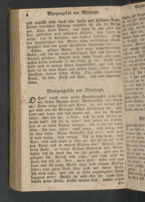 O Herr! durch deine große Barmherzigkeit fange ich mit dieſem Morgen meine Wochenarbeit von neuem an. Deine ewige Liebe und Treue, die mit deinem Se⸗ gen mich und die Meinigen bisher überſchüttet hat, gehe denn auch heute mir von neuem auf, wie die Morgen⸗ röthe! Wer bin ich, o Gott, daß du mich hierher ge⸗ bracht haſt? Ich bin ja, leider! noch immer ein Sünder, dem es an allem Ruhme mangelt, den er vor dir haben ſollte. Ich thue, leider! nicht immer, noch völlig, was ich thun ſollte. Meine Gedanken ſind eitel; mein Herz iſt bald trotzig, bald verzagt. Ach ſo ſiehe denn, mein Gott, mich auch heute ja nicht an, wie ich an mir ſelbſt von Natur und in meinen Sünden bin! Gedenke aber, lieber Vater, an deines Sohnes Gehorſam und Gerech⸗ tigkeit daß ich durch ihn vor dir gerecht, und von dir geſegnet ſey. Verlaß mich nicht, und thue nicht die Hand von mir ab, Gott, mein Heil! Lehre mich auch heute und die ganze Woche thun nach deinem Wohlge⸗ fallen; dein guter Geiſt führe mich auf ebener Bahn. Ich weiß nicht, was mir in dieſer angefangenen Woche begegnen wird: Behüte du mich aber vor allem Uebel, behüte meine Seele, behüte meinen Leib, behüte wesnen