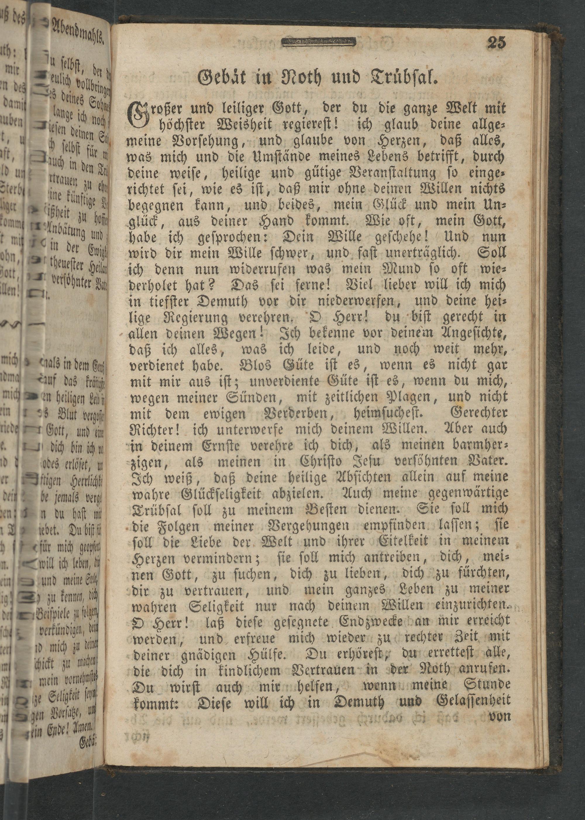 Großer und leiliger Gott, der du die ganze Welt mit höchſter Weisheit regiereſt! ich glaub deine allge⸗ meine Vorſehung, und glaube von Herzen, daß alles, was mich und die Umſtände meines Lebens betrifft, durch deine weiſe, heilige und gütige Veranſtaltung ſo einge⸗ richtet ſei, wie es iſt, daß mir ohne deinen Willen nichts begegnen kann, und beides, mein Glück und mein Un⸗ glück, aus deiner Hand kommt. Wie oft, mein Gott, habe ich geſprochen: Dein Wille geſchehe! Und nun wird dir mein Wille ſchwer, und faſt unerträglich. Soll ich denn nun widerrufen was mein Mund ſo oft wie⸗ derholet hat? Das ſei ferne! Viel lieber will ich mich in tiefſter Demuth vor dir niederwerfen, und deine hei⸗ lige Regierung verehren. O Herr! du biſt gerecht in allen deinen Wegen! Ich bekenne vor deinem Angeſichte, daß ich alles, was ich leide, und noch weit mehr, verdienet habe. Blos Güte iſt es, wenn es nicht gar mit mir aus iſt; unverdiente Güte iſt es, wenn du mich, wegen meiner Sünden, mit zeitlichen Plagen, und nicht mit dem ewigen Verderben, heimſucheſt. Gerechter Richter! ich unterwerfe mich deinem Willen. Aber auch als meinen barmher⸗ zigen, als meinen in Chriſto Jeſu verſöhnten Vater. Ich weiß, daß deine heilige Abſichten allein auf meine wahre Glückſeligkeit abzielen. Anch meine gegenwärtige Trübſal ſoll zu meinem Beſten dienen. Sie ſoll mich die Folgen meiner Vergehungen empfinden laſſen; ſie ſoll die Liebe der Welt und ihrer Eitelkeit in meinem Herzen vermindern; ſie ſoll mich antreiben, dich, mei⸗ nen Gott, zu ſuchen, dich zu lieben, dich zu fürchten, und mein ganzes Leben zu meiner wahren Seligkeit nur nach deinem Willen einzurichten. O Herr! werden, und erfreue mich wieder zu rechter Zeit mit deiner gnädigen Hülfe. Du erhöreſt, du erretteſt alle, die dich in kindlichem Vertrauen in der Noth anrufen.