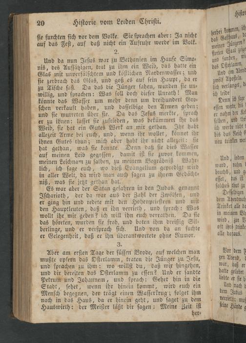 Und da nun Jeſus war zu Bethanien im Hauſe Simo⸗ nis, des Auſſätzigen, trat zu ihm ein Weib, das hatte ein Glas mit unverfälſchtem und köſtlichen Nardenwaſſer; und ſie zerbrach das Glas, und goß es auf ſein Haupt, da er zu Tiſche ſaß. Da das die Jünger ſahen, wurden ſie un⸗ willig, und ſprachen: Was ſoll doch dieſer Unrath! Man könnte das Waſſer um mehr denn um dreihundert Gro⸗ ſchen verkauft haben, und daſſelbige den Armen geben; und ſie murreten über ſie. Da das Jeſus merkte, ſprach er zu ihnen: laſſet ſie zufrieden, was bekümmert ihr das Weib, ſie hat ein Gutes Werk an mir gethan. Ihr habt allezeit Arme bei euch, und, wenn ihr wollet, könnet ihr ihnen Gutes thun; mich aber habt ihr nicht allezeit: ſie hat gethan, was ſie konnte. Waſſ auf meinen Leib gegoſſen, damit iſt ſie zuvor kommen, meinen Leichnam zu ſalben, zu meinem Begräbniß Wahr⸗ lich, ich ſage euch, wo dieß Evangelium gepredigt wird in aller Welt, da wird man auch ſagen zu ihrem Gedächt⸗ niß, was ſie jetzt gethan hat.