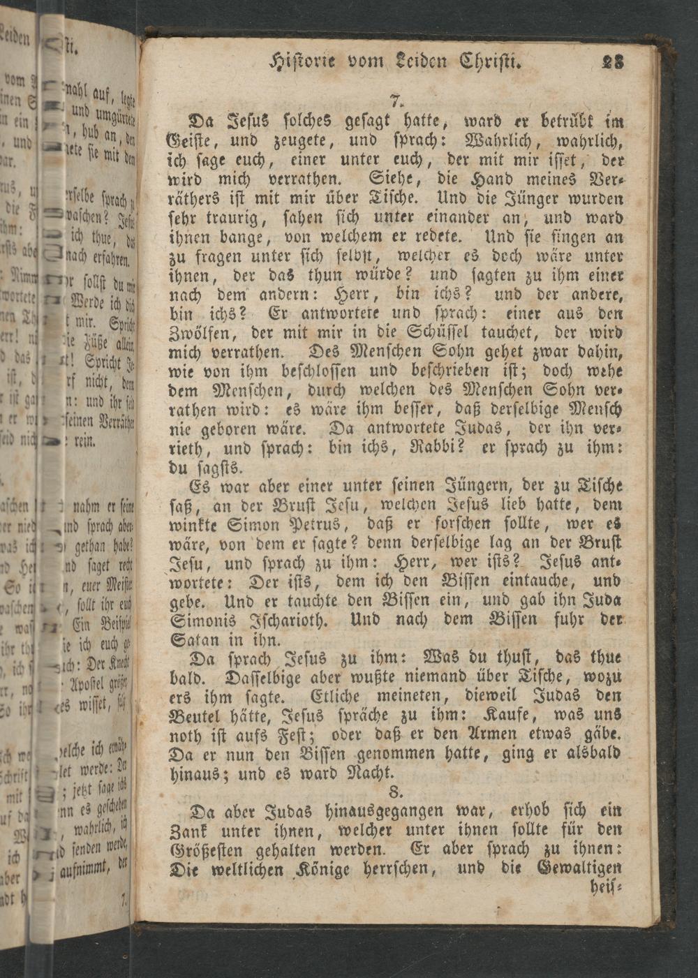 Es war aber einer unter ſeinen Jüngern, der zu Tiſche ſaß, an der Bruſt Jeſu, welchen Jeſus lieb hatte, dem winkte Simon Petrus , daß er forſchen ſollte, wer es wäre, von dem er ſagte? denn derſelbige lag an der Bruſt Jeſu, und ſprach zu ihm: Herr, wer iſts? Jeſus ant⸗