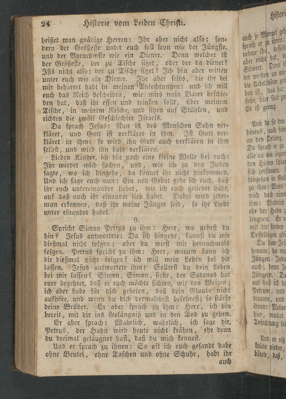 Spricht Simon Petrus zu ihm: Herr, wo geheſt du hin? Jeſus antwortete: Da ich hingehe, kannſt du mir dießmal nicht folgen; aber du wirſt mir hernachmals folgen. Petrus ſpricht zu ihm: Herr, warum kann ich dir dießmal nicht folgen? ich will mein Lehen bei dir laſſen. Jeſus antwortete ihm: Sollteſt du dein Leben bei mir laſſen? Simon, Simon, ſiehe, der Satanas hat euer begehret, daß er euch möchte ſichten, wie den Weizen; ich aber habe für dich gebeten, daß dein Glaube nicht aufhöre, und wenn du dich dermaleinſt bekehreſt; ſo ſtärke deine Brüder. Er aber ſprach zu ihm: Herr, ich bin bereit, mit dir in Gefängniß und in den Tod zu gehen.