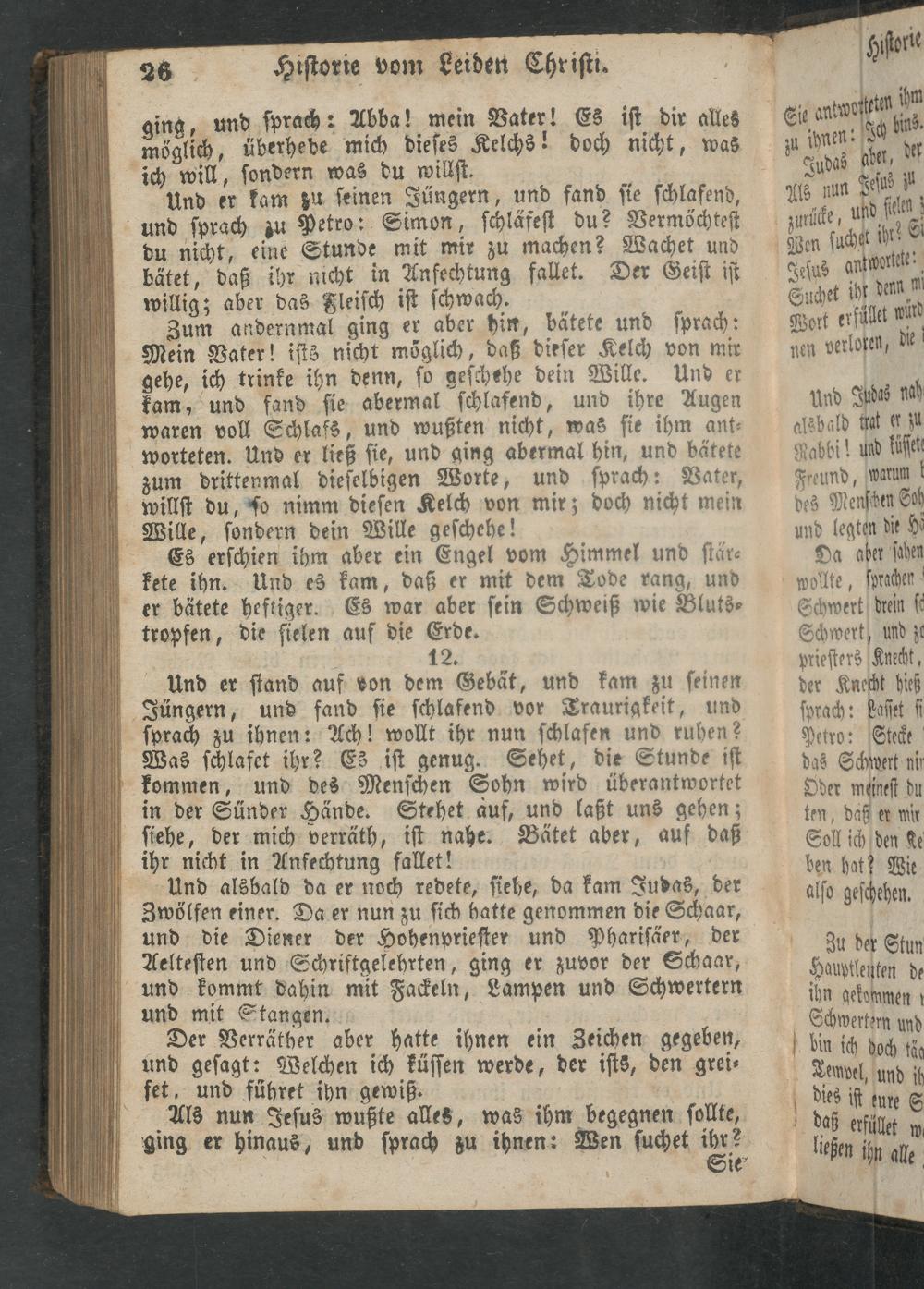 Und er ſtand auf von dem Gebät, und kam zu ſeinen Jüngern, und fand ſie ſchlafend vor Traurigkeit, und ſprach zu ihnen: Ach! wollt ihr nun ſchlafen und ruhen? Was ſchlafet ihr? Es iſt genug. Sehet, die Stunde iſt kommen, und des Menſchen Sohn wird überantwortet in der Sünder Hände. Stehet auf, und laßt uns gehen; ſiehe, der mich verräth, iſt nahe. Bätet aber, auf daß ihr nicht in Anfechtung fallet!
