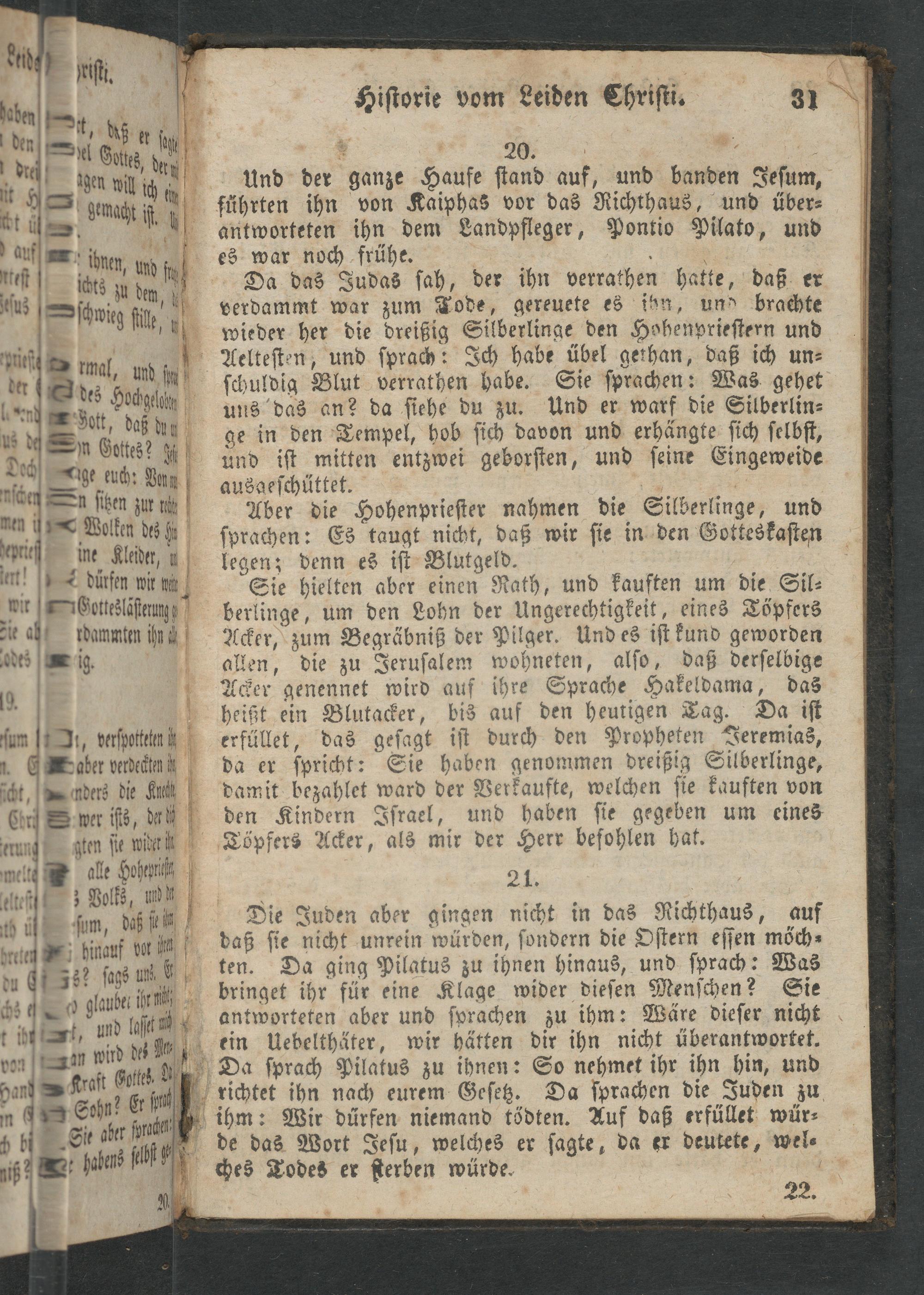 Da das Judas ſah, der ihn verrathen hatte, daß er verdammt war zum Tode, gereuete es ihn, und brachte wieder her die dreißig Silberlinge den Hohenprieſtern und Aelteſten, und ſprach: Ich habe übel gethan, daß ich un⸗ ſchuldig Blut verrathen habe. Sie ſprachen: Was gehet uns das an? da ſiehe du zu. Und er warf die Silberlin⸗ ge in den Tempel, hob ſich davon und erhängte ſich ſelbſt, und iſt mitten entzwei geborſten, und ſeine Eingeweide ausgeſchüttet.