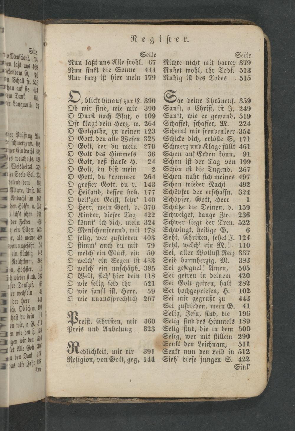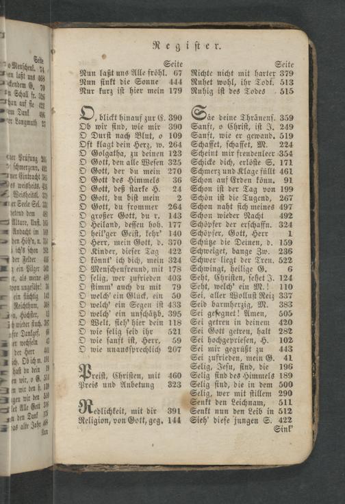 Schön iſt die Tugend, 267 Schon naht ſich meines 497 Schon wieder Nacht 492 Schöpfer der erſchaffn. 324 Schöpfer, Gott, Herr 1 Schütze die Deinen, d. 159 Schweiget, bange Zw. 236 Schwer liegt der Tren. 522 Schwingt, heilige G. 6 Seht, Chriſten, ſehet J. 124 Seht, welch' ein M.! 110 Sei, aller Wolluſt Reiz 337 Seid barmherzig, M. 383 Sei geſegnet! Amen, 505 Sei getreu in deinem 420 Sei Gott getreu, halt 282 Sei hochgeprieſen, H. 102 Sei mir gegrüßt zu 443 Sei zufrieden, mein G. 41 Selig, Jeſu, ſind, die 196 Selig ſind des Himmels 189 Selig ſind, die in dem 500 Selig, wer mit ſtillem 290 Senkt den Leichnam, 511 Senkt nun den Leib in 512 Sieh' dieſe jungen S. 422