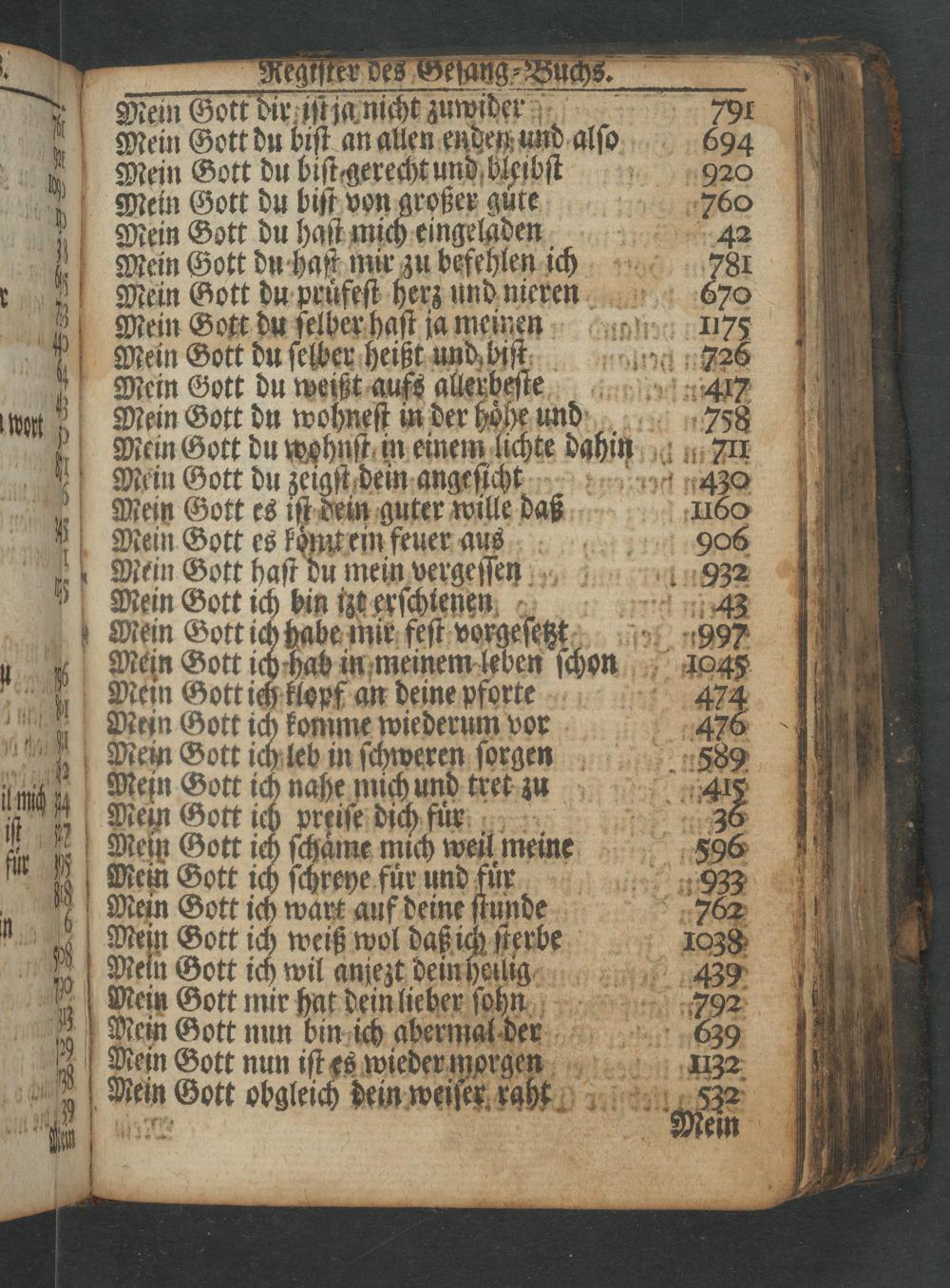 Kein Gott du pruͤfeſt herz und nieren 670 Mein Gott du ſelber haſt ja meinen 1175 Mein Gott du ſelber heißt und biiſt 726 Mein Gott du weißt aufs allerbeſte 417 Mein Gott du wohneſt in der hoͤhe nd 758 Mein Gott du wohnſt in einem lichte dahin 711 Mein Gott du zeigſt dein angeſicht 430 Mein Gott es iſt dein guter wille daß 160 tein Gott es koͤmtein feuer aus 906 Mein Gott haſt du mein vergeſen 932 Mein Gott ich bin izt erſchtenn„ Mein Gott ich habe mir feſt vorgeſett. 997 Mein Sott ich hab in meinem leben ſchon 035 Mein Gott ich klopf an deine pforte 474 Mein Gott ich komme wiederum vor 4276 Mein Gott ich leb in ſchweren ſorgeen 889 Mein Gott ich nahe mich und tret zu 44 Mein Gott preiſe dich uur 306