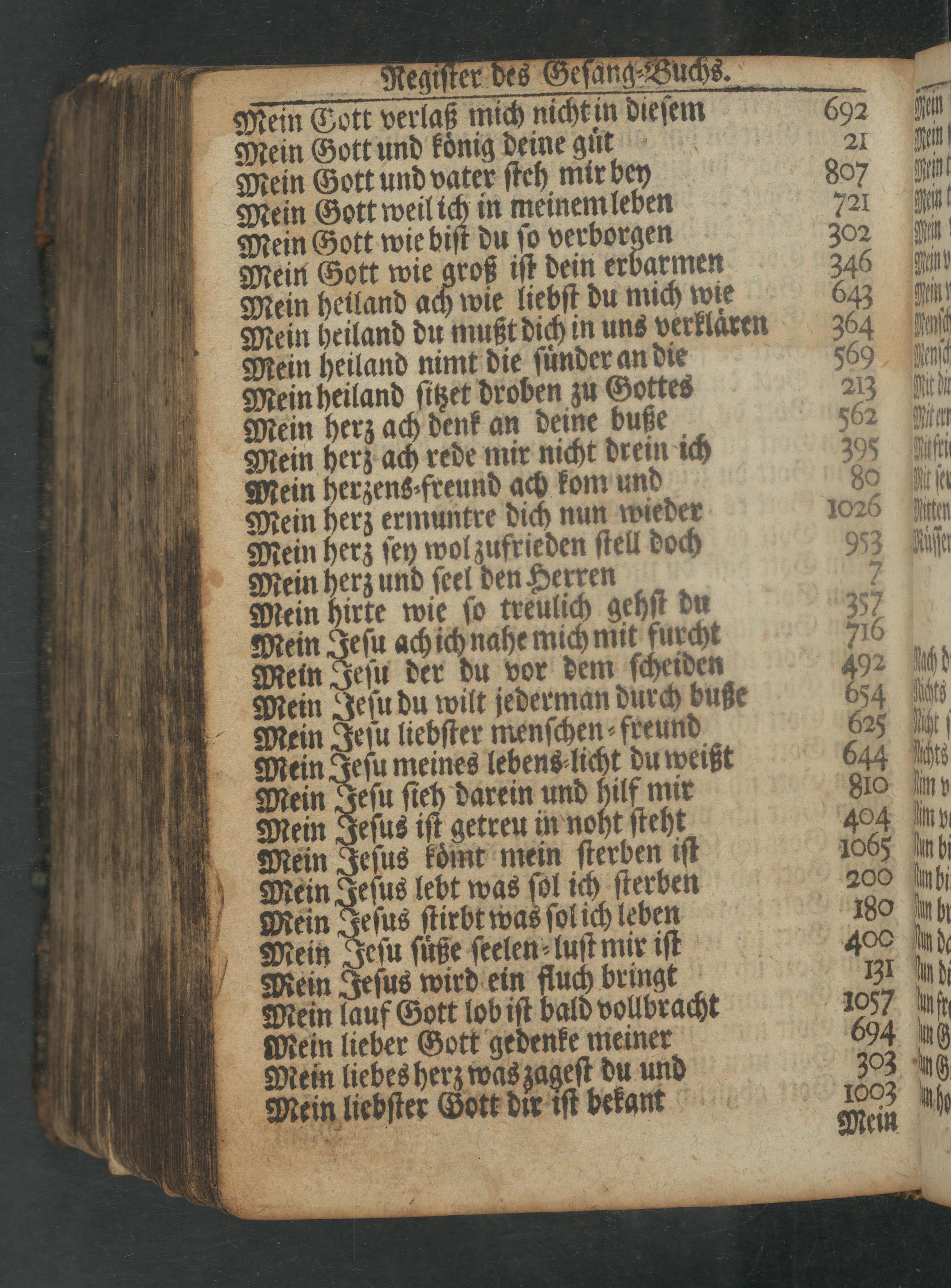 Mein Gott und vater ſteh mir bey 807 Fiit Mein Gott weil ich in meinemleben 721 Mnt Mein Gott wie biſt du ſo verborgen 302 WM Mein Gott wie groß iſt dein erbarmen 346 Pgnt Mein heiland ach wie liebſt du mich wie 643 HM Mein heiland du mußt dich in uns verklaͤren 364 Aſt Mein heiland nimt die ſuͤnder an die 56569 inſc Mein heiland ſitzet droben zu Gottes 233 UAtüü Mein herz ach denk an deine buße 562 Rten Mein herz ach rede mir nicht drein ich 395 Mfri Mein herzens⸗freund ach kom und 30 it ſe