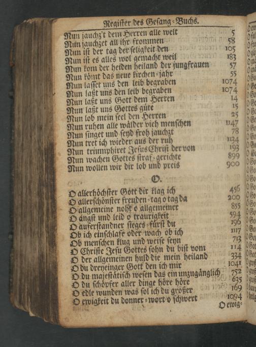 Nun laſſet uns den leib begraben b 1074 Nun laßt uns den leib begraben 1074 566 Nun laßt uns Gott dem Herren— 14 09, Nun laßt uns Gottes gunununununite 15 0G0 Nun lob mein ſeel den Herren 25 06 Nun ruhen alle waͤlder vieh menſchen u4h 009 Nun ſinget und ſeyd froh jauchzt 78 06o Nun tret ich wieder aus der ruh 234 069 Nun triumphiret JeſusChriſt der von 193 09 MNun wachen Gottes ſtraf⸗gerichte 890 0, Nuun wollen wir dir lob und preis 900 d⸗ ö“ b 90o Oallerhoͤchſter Gott dir klag ich 455 9o Oalleerſchoͤnſter freuden⸗tag otag da 200 00p Dallgemeine noht o allgemeiner 855 060 O angſt und leid o traurigket G O auferſtandner ſieges⸗ fuͤrſt du 195(Go Ob ich einſchlafe oder wach ob ich 117 Go Ob menſchen klug und weiſe ſeyn 243 069