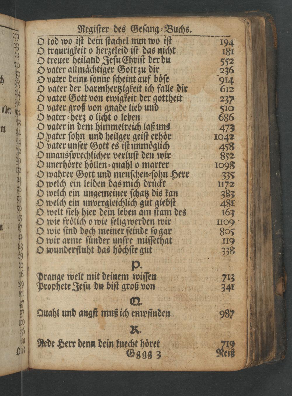 4 DO tod wo iſt dein ſtachel nun wo iit 194 8 D traurigkeit o herzeleid iſt das nicht 181 O treuer heiland Jeſu Chriſt der du 552 S O vater allmaͤchtiger Gott zu dirr 236 h O vater deine ſonne ſcheint auf oſe 914 O vater der barmhereſateit ich falle die 612 1 O vater Gott von ewigkeit der gottheit 237 altt. O vater groß von gnade lieb und 510 b O vater herz o licht o leben 3 686 m O vater in dem himmelreich laßuns 473 8 Oroater ſohn und heilger geiſt erhoͤr 1042 O bater unſer Gott es iſt unmoͤglich 48 O unausſprechlicher verluſt den wir 852 1 O unerhoͤrte hoͤllen⸗quahl o marter 1098 1 O wahrer Gott und menſchen⸗ſohn Herr 335 1 O welch ein leiden das mich druͤckkt 1172 b 4 b S wet ein ungemeiner ſchatz dis kan 383 O welch ein unvergleichlich gut giebſt 481 O welt ſieh hier dein leben am ſtam des 16 3 p O wie froͤlich o wie ſeligwerden wir 1109 DO wie ſind dech meiner feinde ſo gar 805 O wir arme ſuͤnder unſre miſſethat 119 1 6 O wunderfluht das hoͤchſte gut 338 0 P. 5Prange welt mit deinem wiſen 7 83 1 Prophete Jeſu du biſt groß von 341 1„–„o0G. 6 Quahl und angſt muß ich empfinden 987 5 1 BNA. 2 3 Nede Herr denn dein knecht hoͤret S Gggg 3