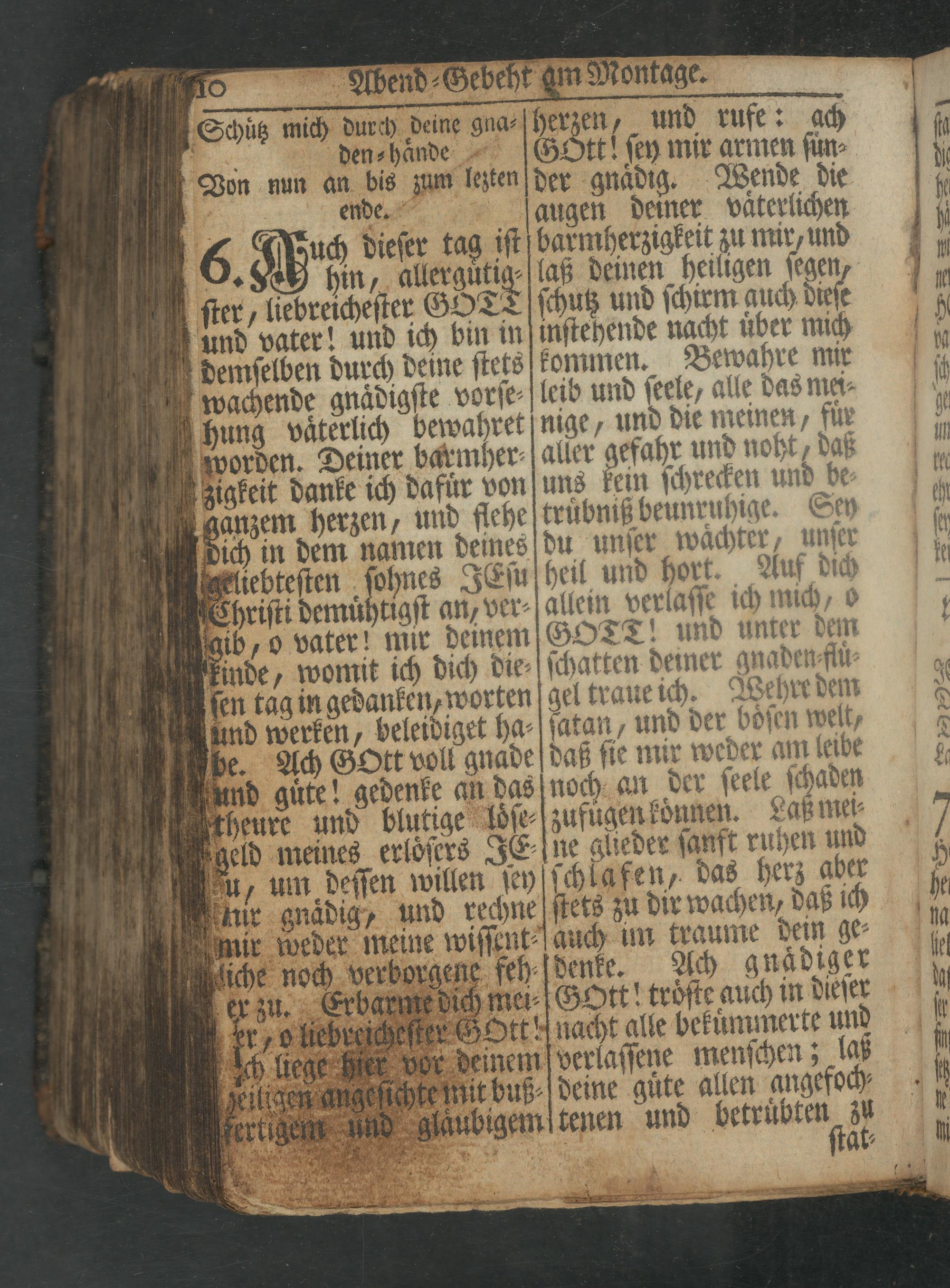 ſchutz und ſchirm auch dieſe inſtehende nacht uͤber mich kommen. Bewahre mir leib und ſeele, alle das mei⸗ nige, und die meinen, fuͤr aller gefahr und noht, daß uns kein ſchrecken und be⸗ truͤbniß beunruhige. Sey du unſer waͤchter, unſer