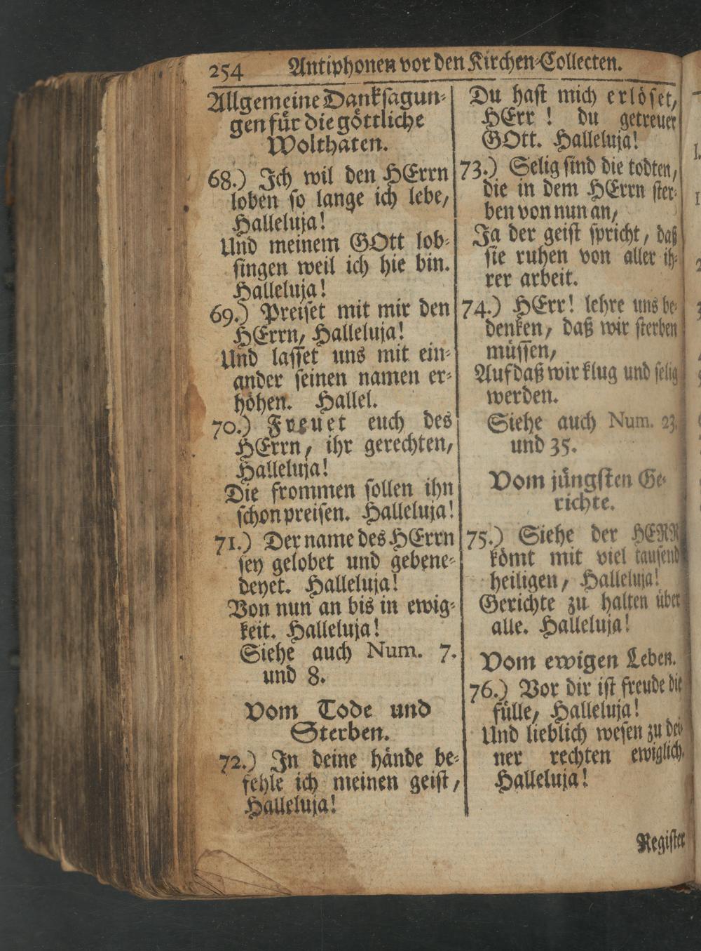 Du haſt mich erloͤſet, HErr! du Vlaret GOtt. Halleluja! 73.) Selig ſind die todten, die in dem HErrn ſter⸗ ben von nunan, Ja der geiſt ſpricht, daß ſie ruhen von aller iß⸗ rer arbeit. 74.) HErr! lehre uns be denken, daß wir ſterben muſſen, Aufdaß wir klug und ſelg⸗ werden. b Siehe auch Num. und 35. 4
