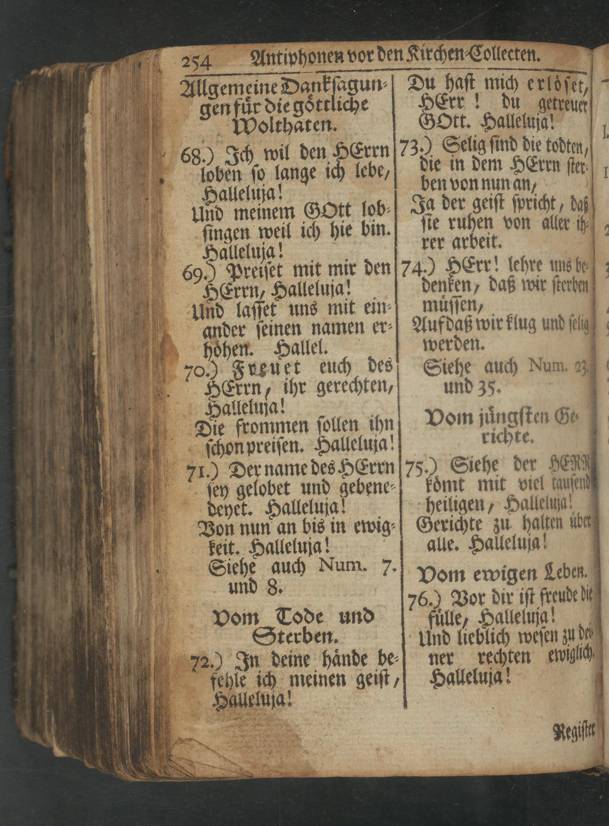 75.) Siehe der HENN koͤmt mit viel kauſende heiligen, Hallelua! Gerichte zu halten uͤbert alle. Hallelunlu! Vom ewigen Leben. 76.) Vor dir iſt freude de fuͤlle, Halleluilal Und lieblich weſen zu den ner rechten ewiglch