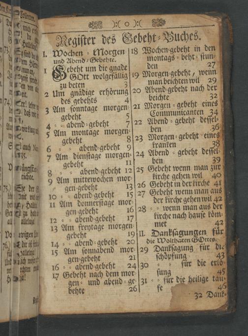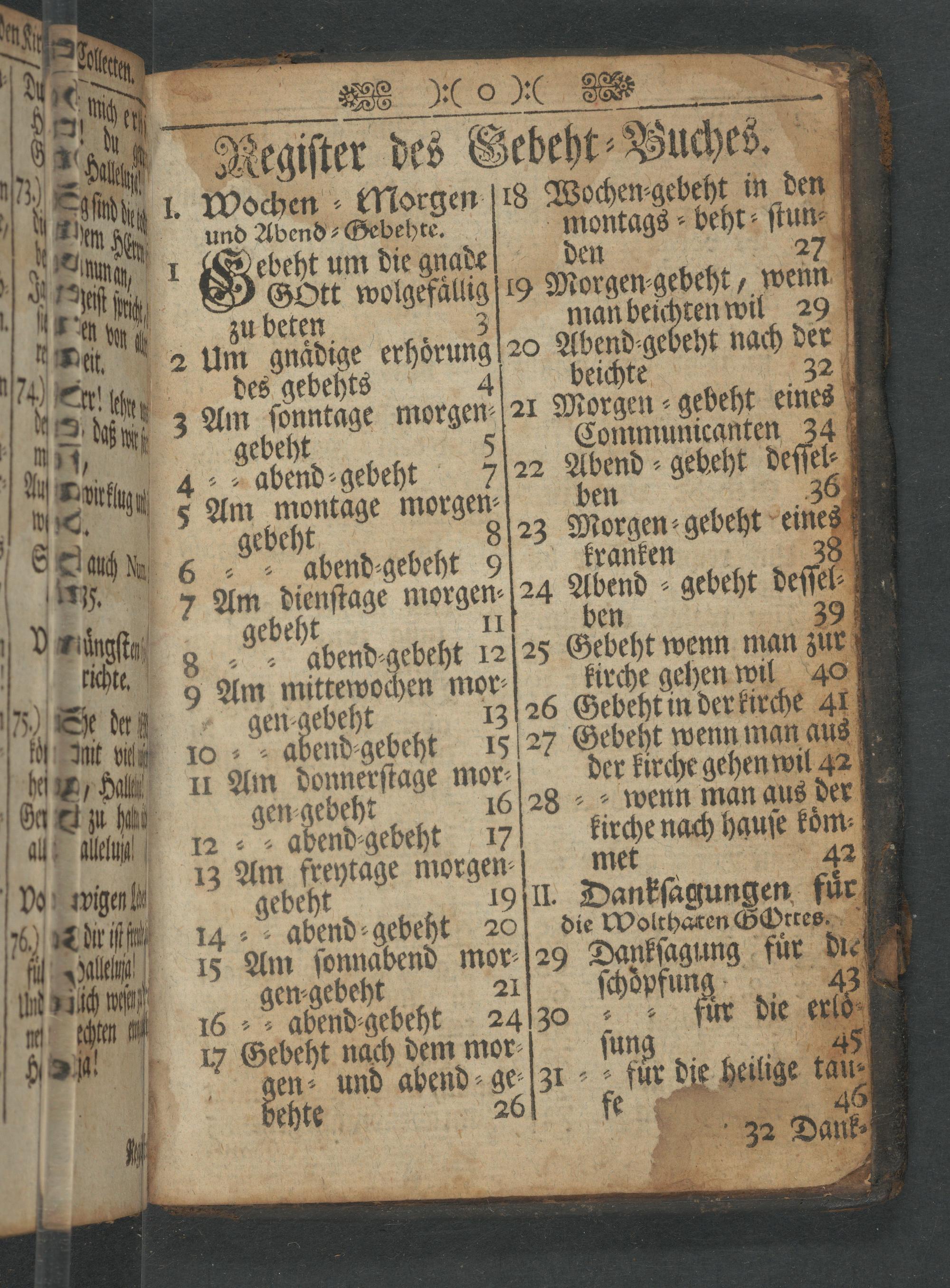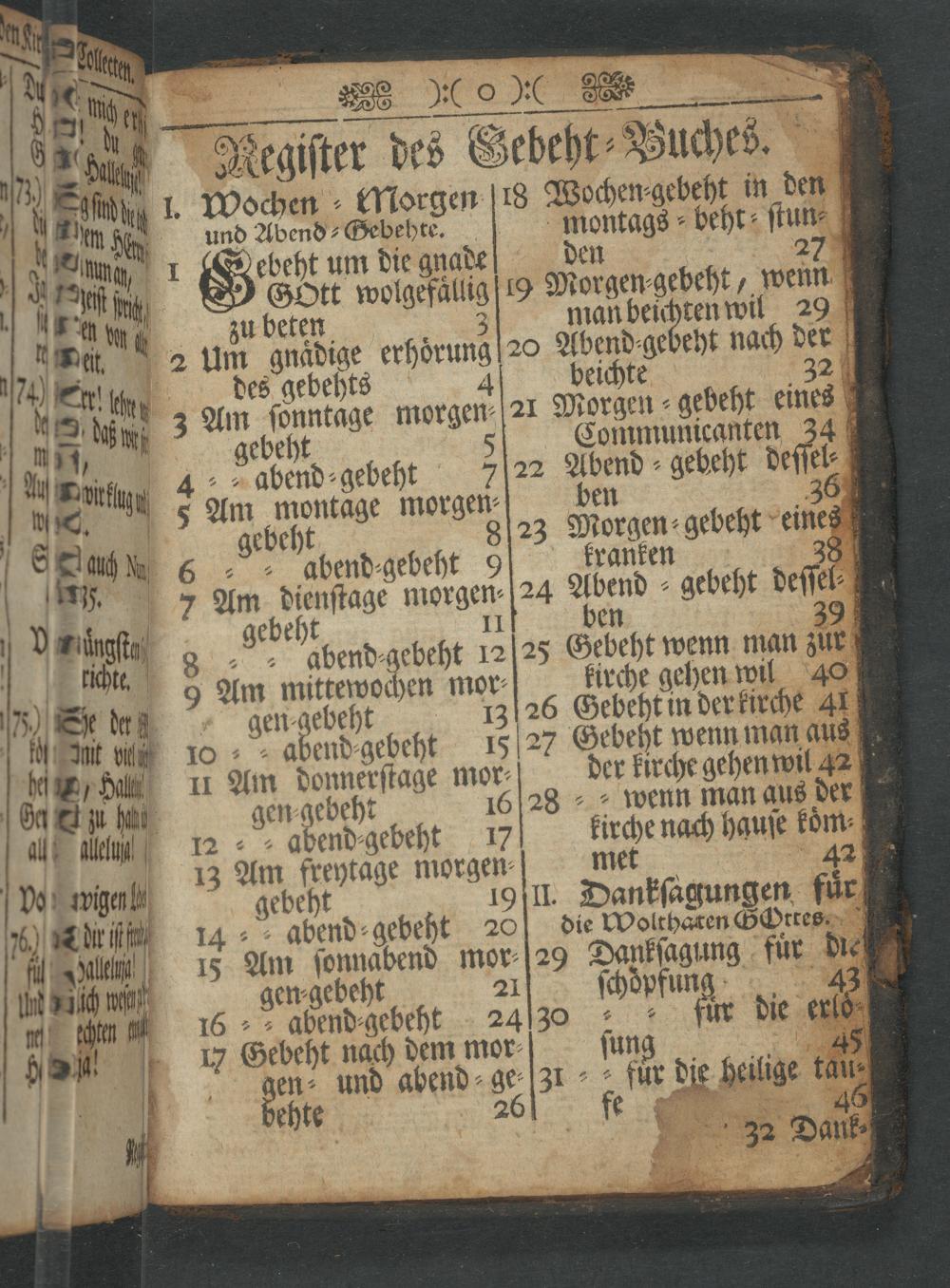 1. Wochen⸗ qlorgen 188 Wo hen gebeht in den und Abend⸗Gebehte. montags⸗beht⸗ſtun⸗ 3 debeht um die gnade den 27 GOtt wolgefaͤll ig 19 Morgen⸗ gebeht, wenn zu beten man beichten wil 29 2 um gnaͤdige erhoͤrung 20 Abend⸗gebeht nach der des gebehts beichte
