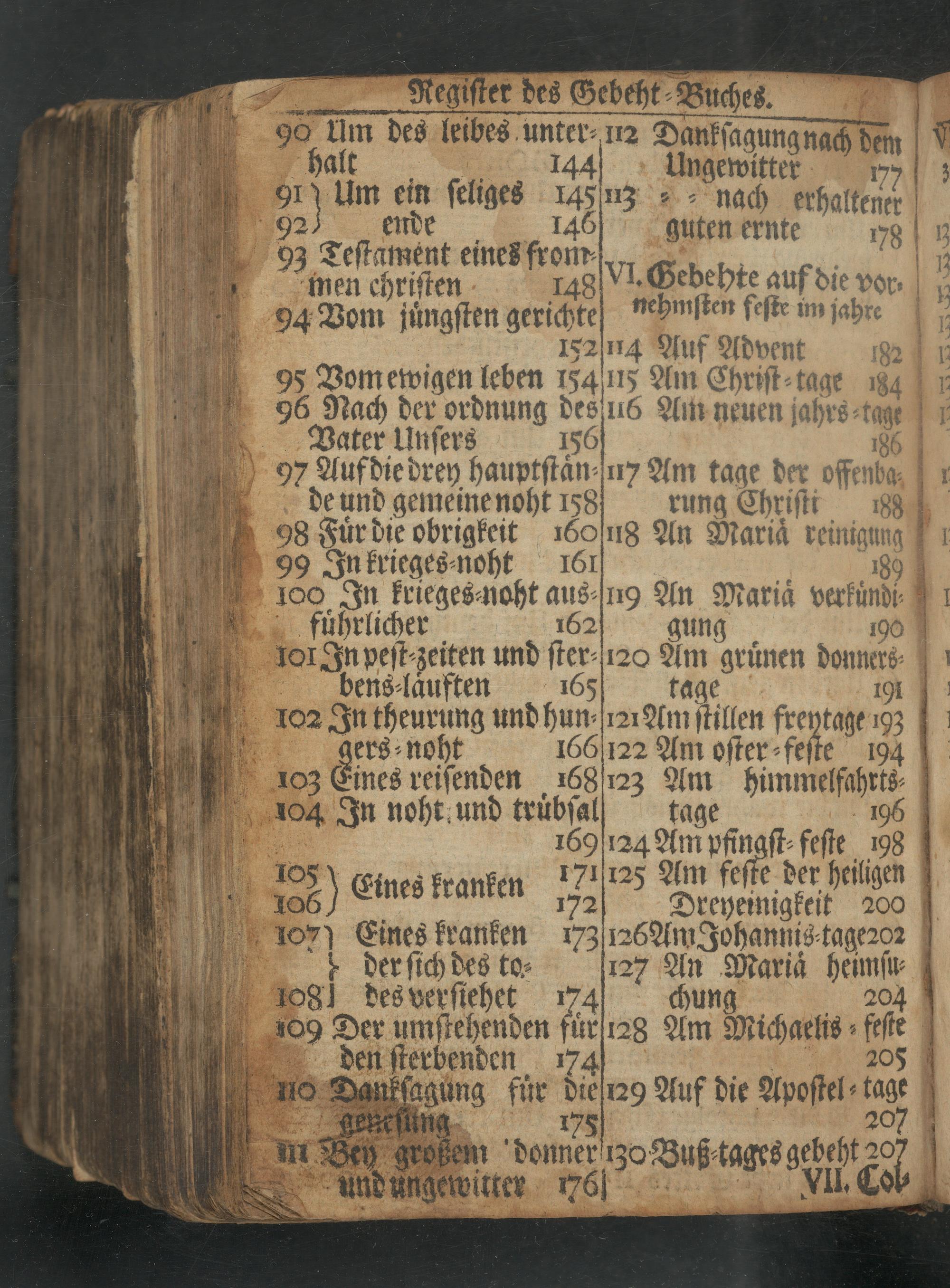 b 13 9¹ Um ein ſeliges 145 92 ende 893 Teſtament eines from⸗ men chriſten 148 94 Vom fuͤngſten gerichte 152 95 Vom ewigen leben 154 96 Nach der ordnung des Vater Unſers 156 97 Auf die drey hauptſtaͤn⸗ de und gemeine noht 158 98 Fuͤrd die obrigkeit 160 99 In krieges⸗noht 161 100 In krieges⸗noht aus⸗ fuͤhrlicher 162 101 In peſt⸗ zeiten und ſter⸗ bens⸗ laͤuften 102 In theurung und hun⸗ 4 gers noht 166 103 Eines reiſenden 168 104 In noht und truͤbſal rha 171 172